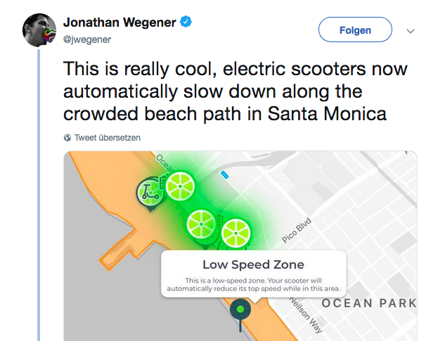 In Fußgängerzonen in Wien werden Sharing eScooter wie limebike, BirdRide oder TierMobility auch bald automatisch auf Schritttempo gedrosselt werden, wird diese Technik auch für Autos kommen? Spannende neue Themen tun sich auf. Kein zu schnelles Fahren mehr möglich. Beispiel Santa Monica