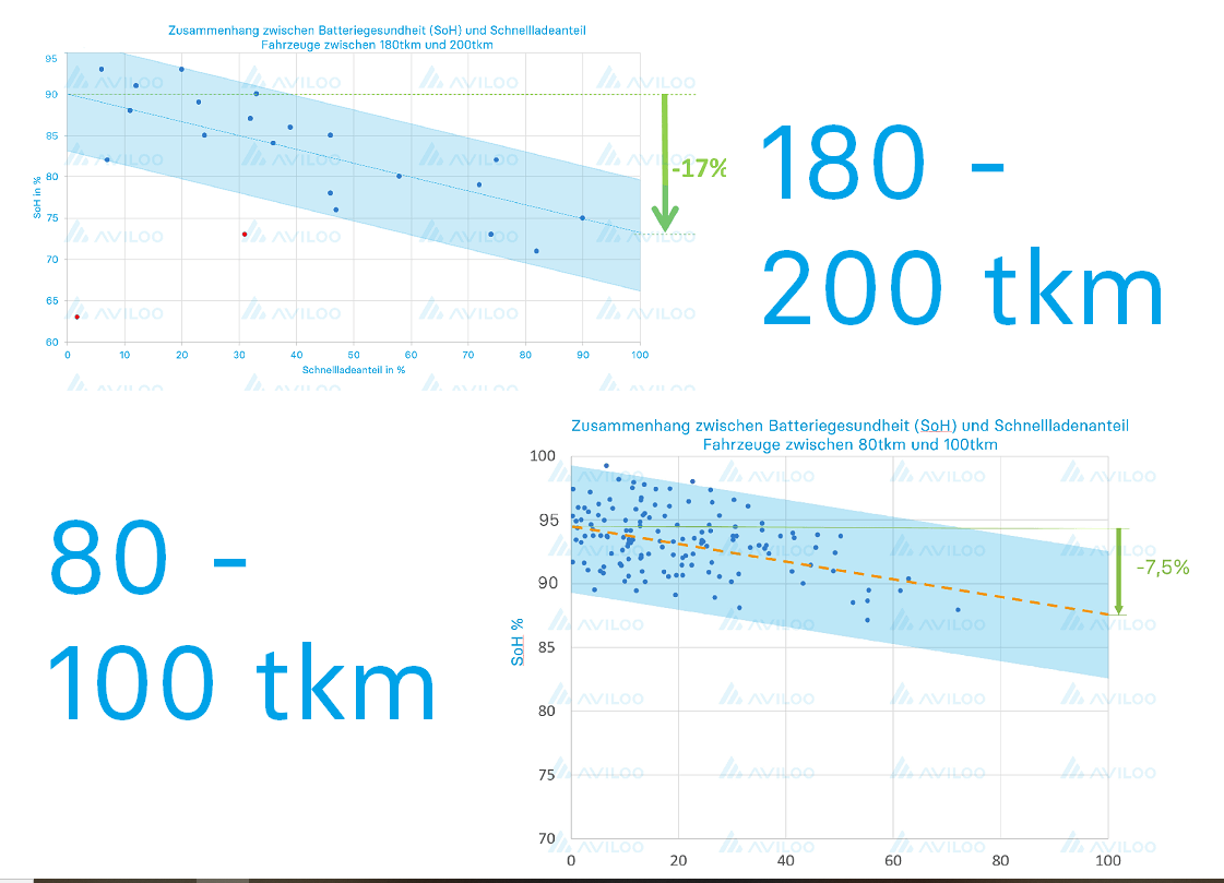 Krass, oder? Ein Auto dass 80% Schnellgeladen wurde ist bei 180000km mit 73% Rest tot, ein Auto das unter 10% Schnellgeladen wurde ist bei 180000 mit 95% praktisch unverbraucht.
