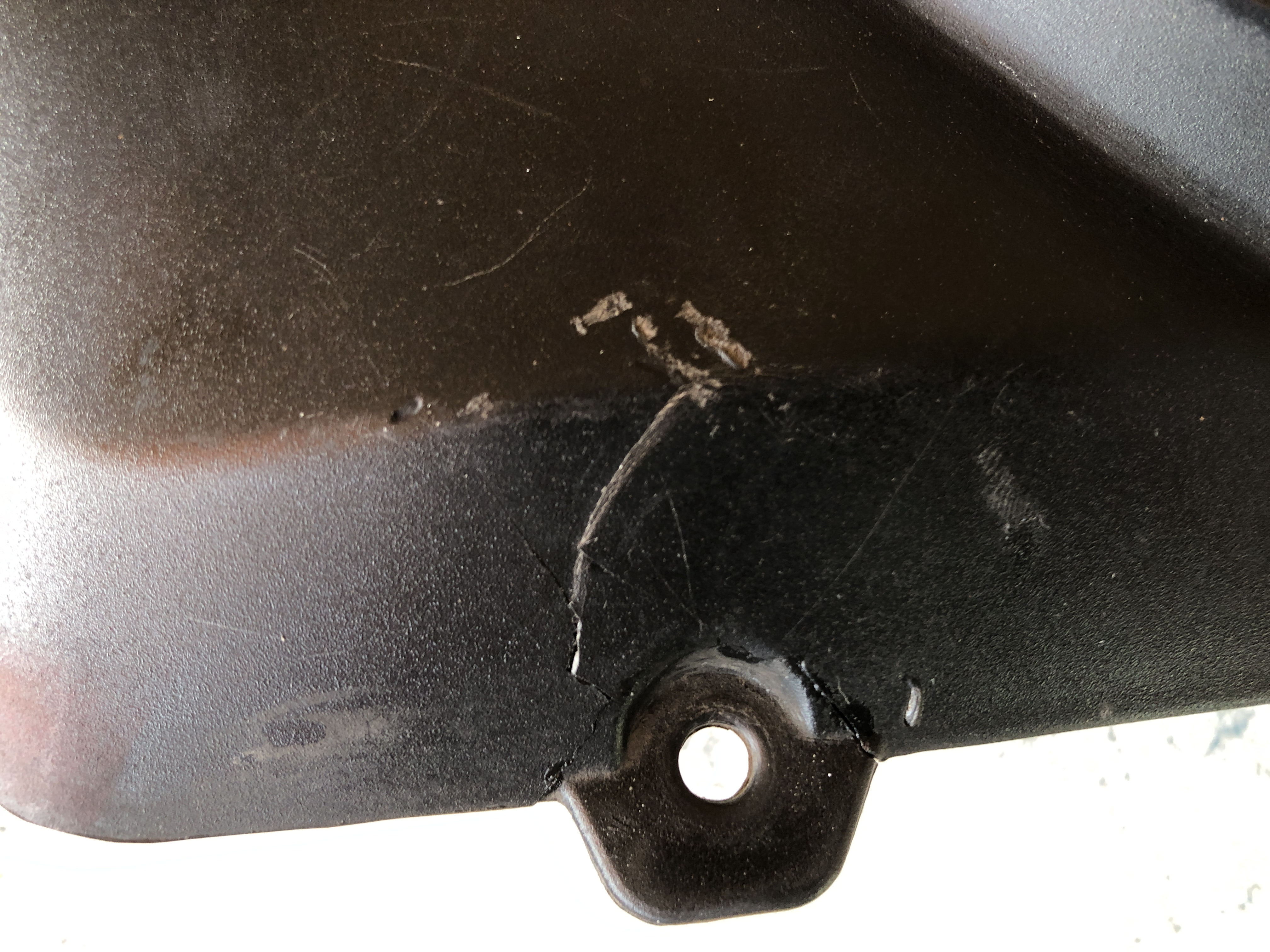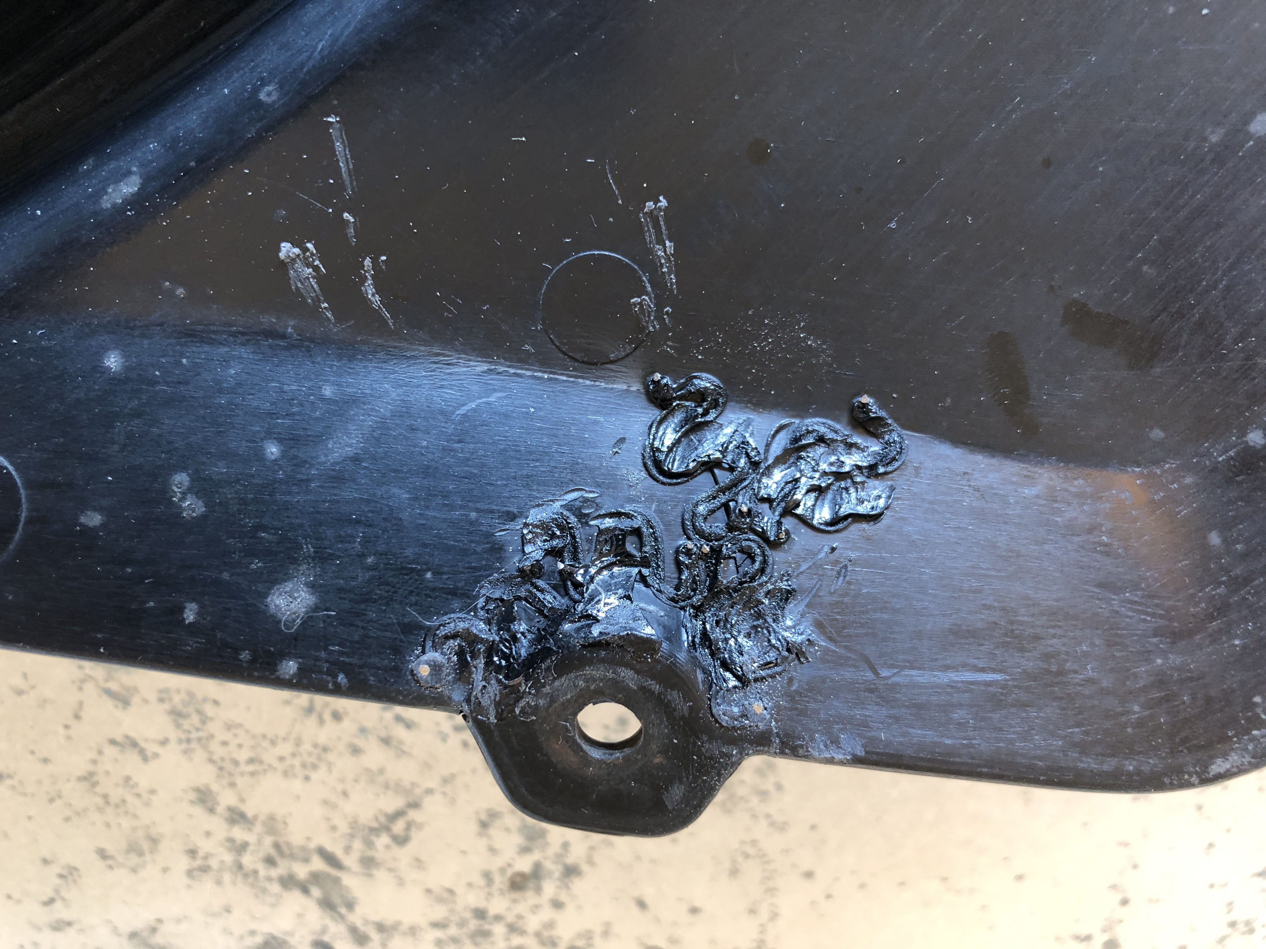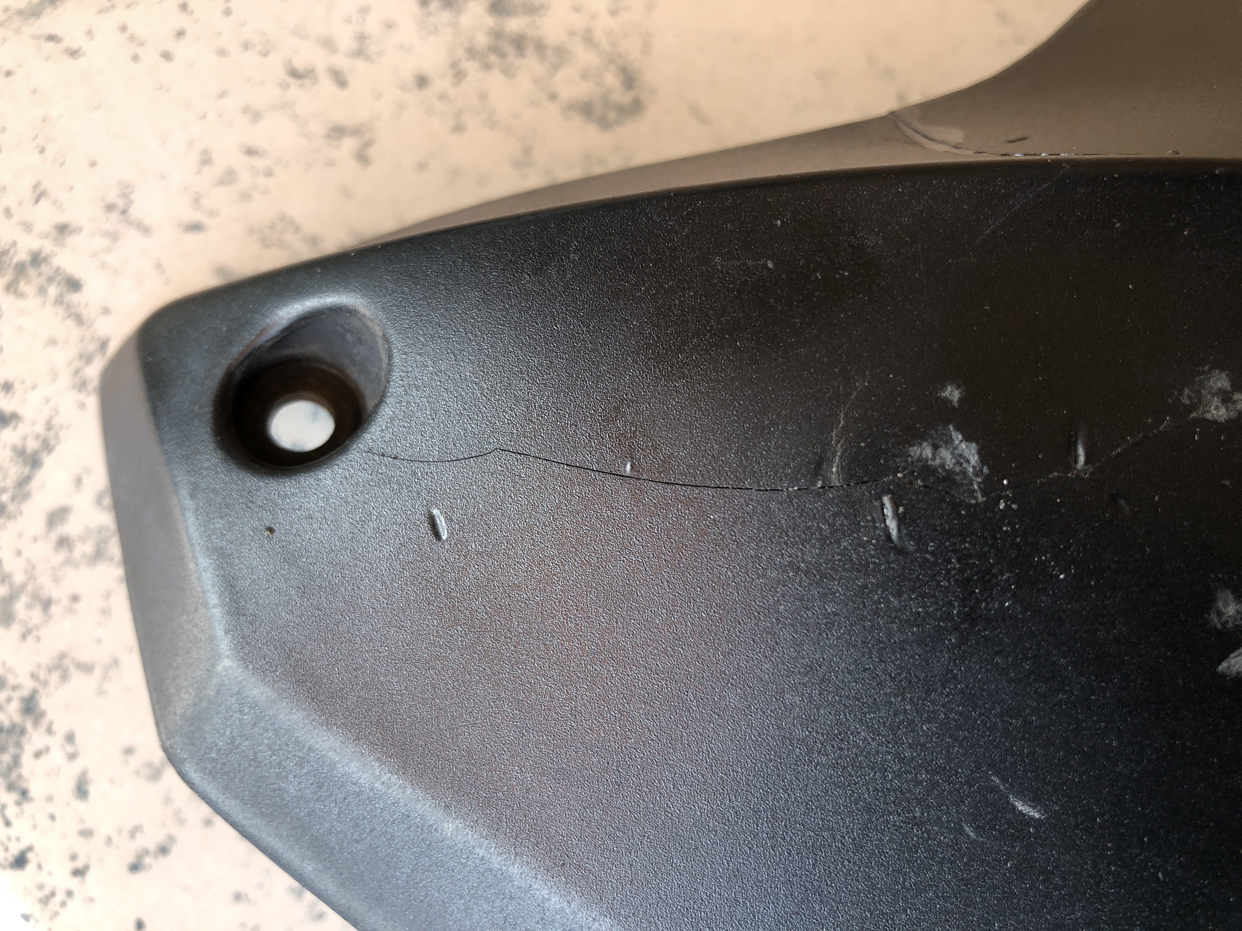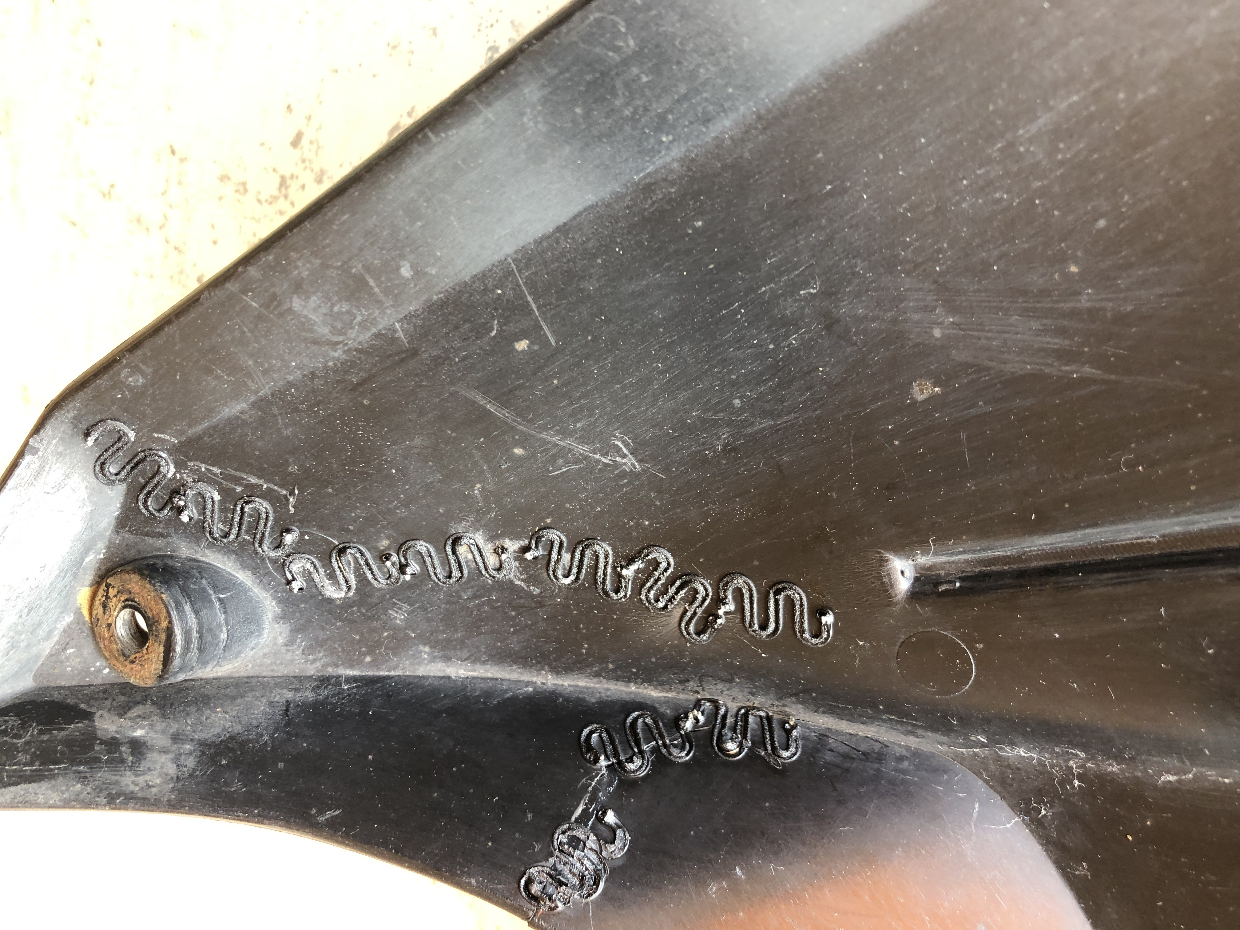 Und heute kam die bestellte Kunststoff-Schweißpistole an, also gleich die linke Batterieverkleidung abgeschraubt, und in gut einer 1h die vielen Risse von meinem Anfahrunfall vorletztes Jahr wieder vernäht. Auch den komplett abgebrochenen hinteren Anschraubpunkt konnte ich wieder anbringen