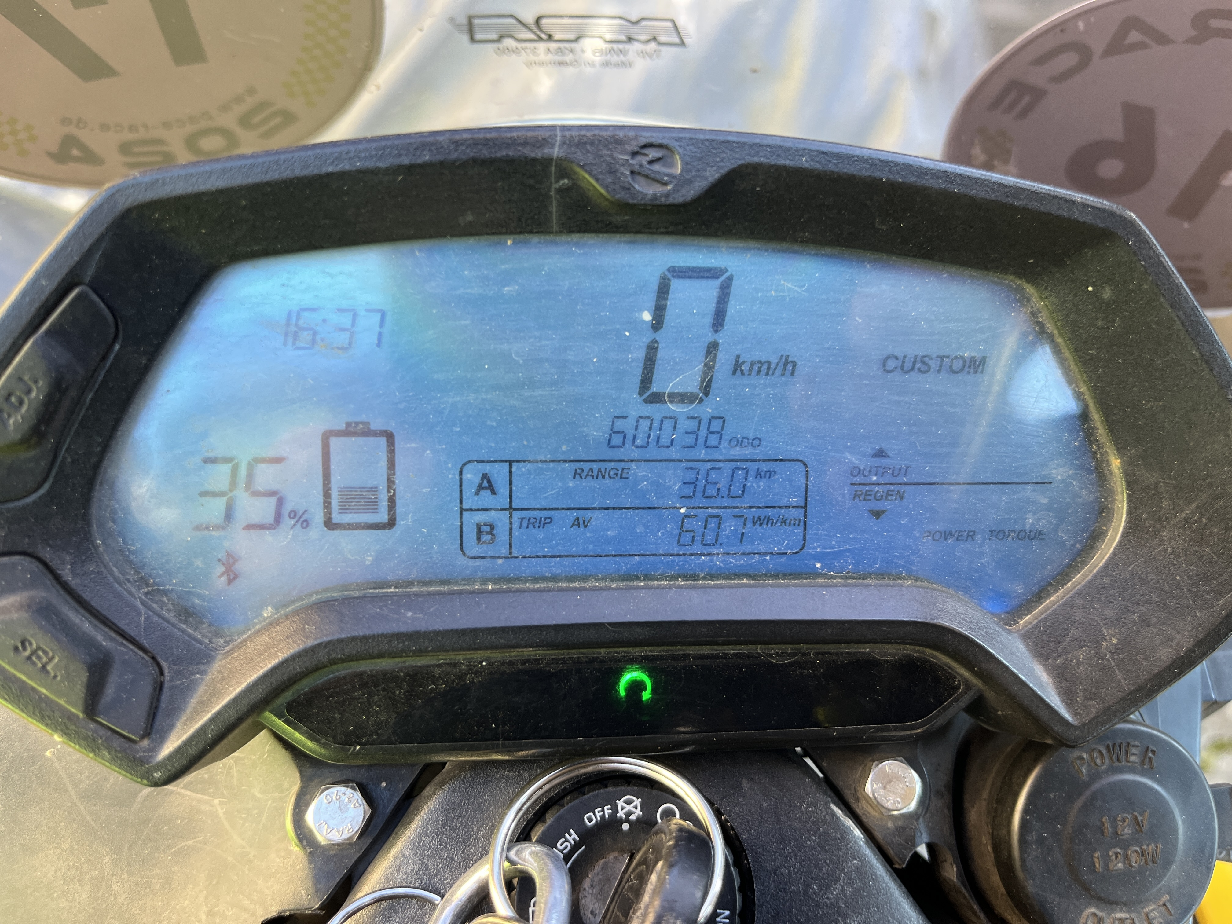 Nur die ersten 1000km waren nicht meine, was die größten Schwierigkeiten auslöste: gemäß der damaligen Zero Vorschrift war sie das erste Jahr fast dauerhaft eingesteckt beim Händler gestanden, was die erste Batterie schon kurz nach meinem Kauf in die Knie zwang, und die verrückten Probefahrer hatten den ersten Zahnriemen, Ritzel und Riemenrad weit vor der Zeit verschlissen... Zeros Batteriegrantie bescherte mir aber eine recht frische 2019er ZF 7.2. statt der alten ZF6.5 Batterie