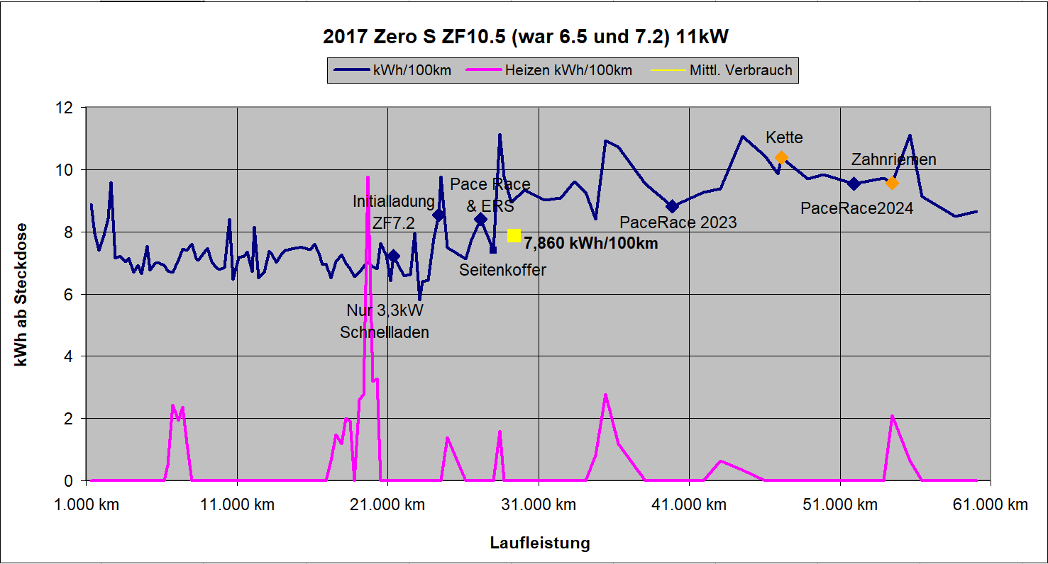 Magenta ist der zusätzliche Energiebedarf im Winter durch den Heizlüfter, der vor allem die Batterie aufwärmt, aber auch die ganze Zero, unter der Kompletthaube. Bei 20 000km, im Winter 2019/2020, war es außergewöhnlich kalt, weshalb es dort die große Spitze jenseits des Fahrverbrauchs gibt. Aber ohne die Heizung hätte ich da nicht mehr fahren können