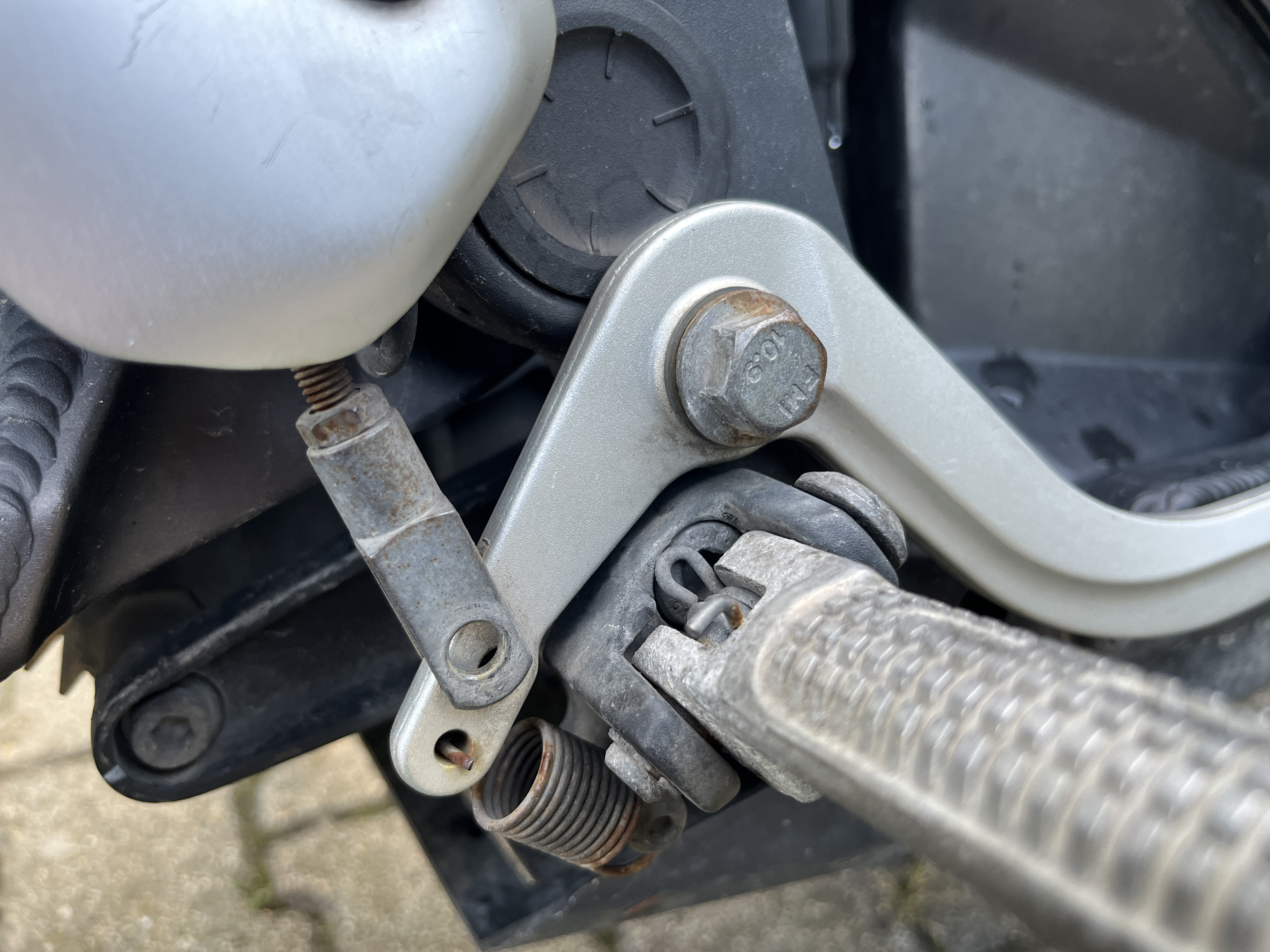 ABER: Als ich am Fußbremshebel gepumpt habe, um die neuen Bremsbeläge (TRW MCB672) anzulegen, fielen mir fast die Augen raus, denn der Bolzen zwischen Bremshebel und der Gabel der Bremspumpe fehlte, da war nur ein Loch