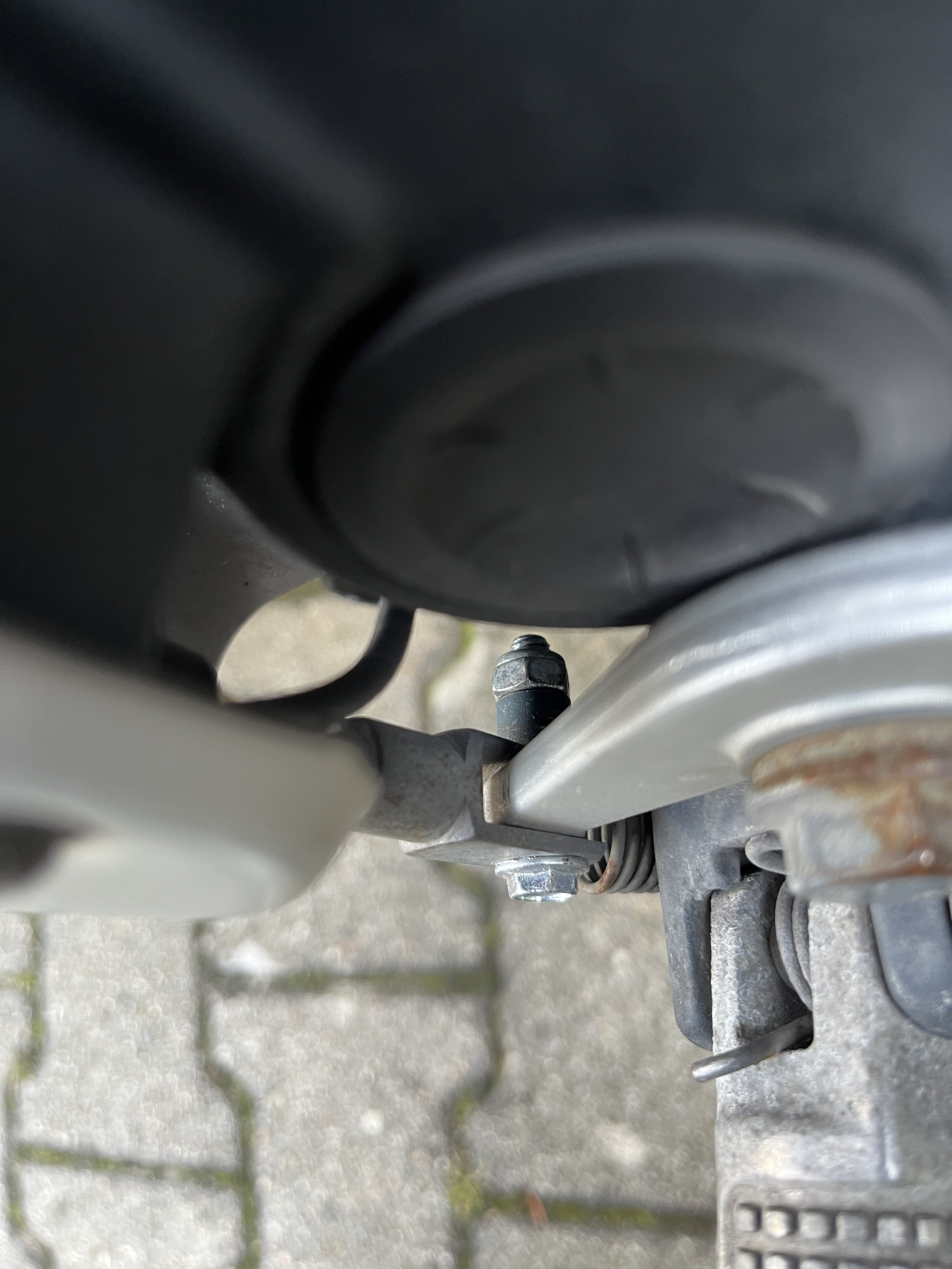 Da hieß es diverse Grabbelschubladen zu durchforsten. Ich fand eine M6 Schaftschraube aus meinem e-Sprit Fury Bestand, mit etwas zu langem Schaft. Eine Messing Distanzhülse konnte aber den Abstand zum Gewinde gut überbrücken, und eine zusätzlich mit Loctite mittelfest gesicherte Sicherungsmutter gewährleistet nun wieder die direkte Kopplung vom Fußbremshebel mit der Bremspumpengabel: