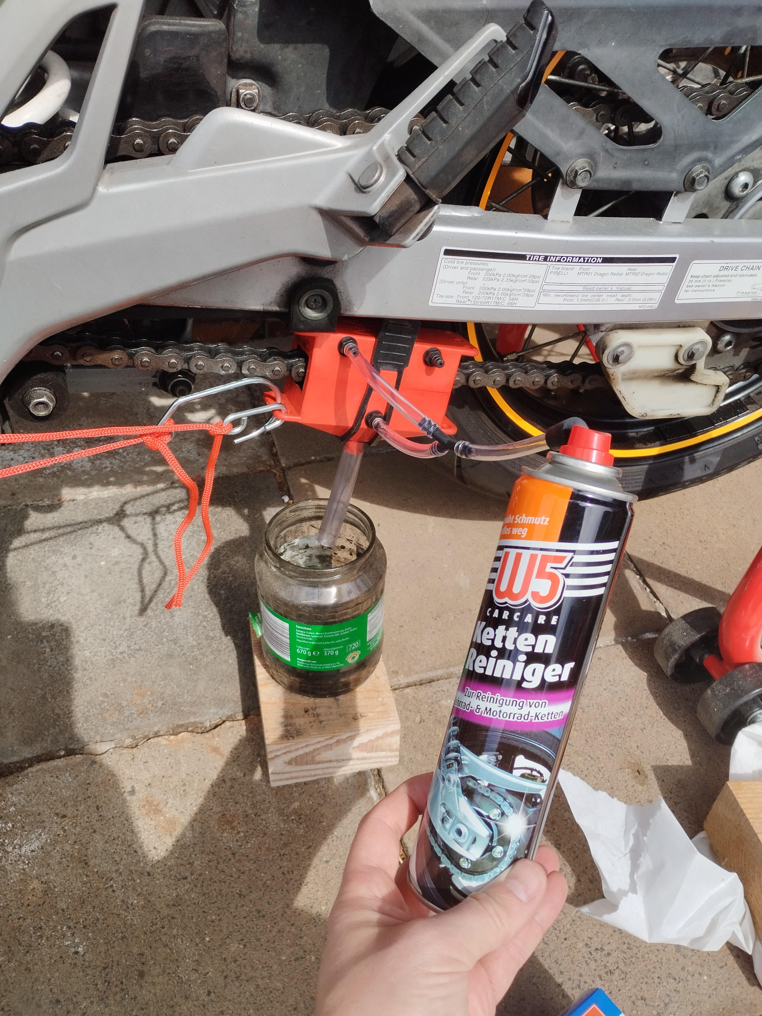 Die vorderen zwei schwarzen Anschlüsse werden zur Reinigung mit Kettenreiniger genutzt, anschließend Kette etwas "abtrocknen" lassen, dann über den hinteren Anschluss das Kettenfett (ich nehme weißes Kettenspray) auftragen.