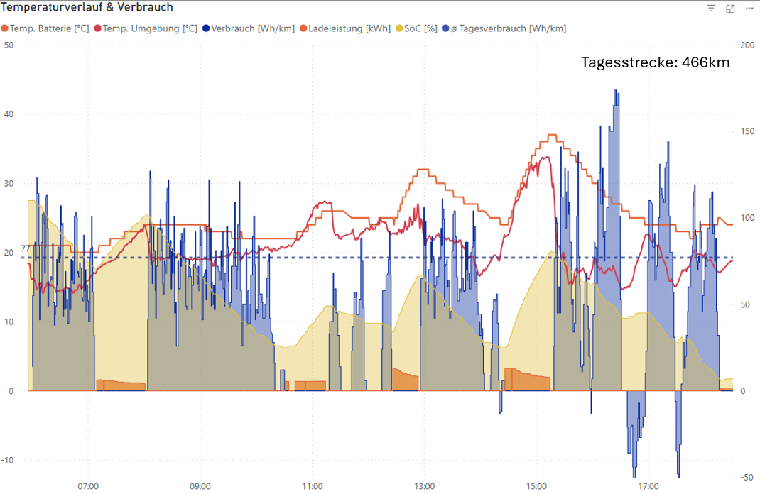 Meine Meinung: An die begrenzende Temperatur der Batterie kommt man bei Überlandfahrt nur bei solchen extremen Umgebungstemperaturen. Ich bin auch schon mehr als 500 Kilometer an einem Tag gefahren (davon habe ich aber keine Aufzeichnung) - da waren die Umgebungstemperaturen im 'normalen' Bereich und da gab es auch keine Probleme bzgl. zu hoher Batterietemperaturen.