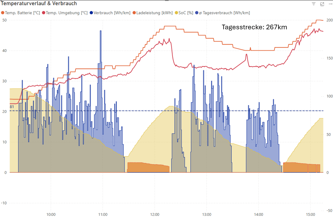 Da ist die Batterietemperatur dann bei 50°C angekommen. Das Ganze war am 15. August 2025, da hatte es bei Losfahrt um 9:30 Uhr schon eine Umgebungstemperatur von 28°C, die dann nach 1 Stunde schon bei 32°C gelegen ist und Nachmittags bei knapp 35°C lag.