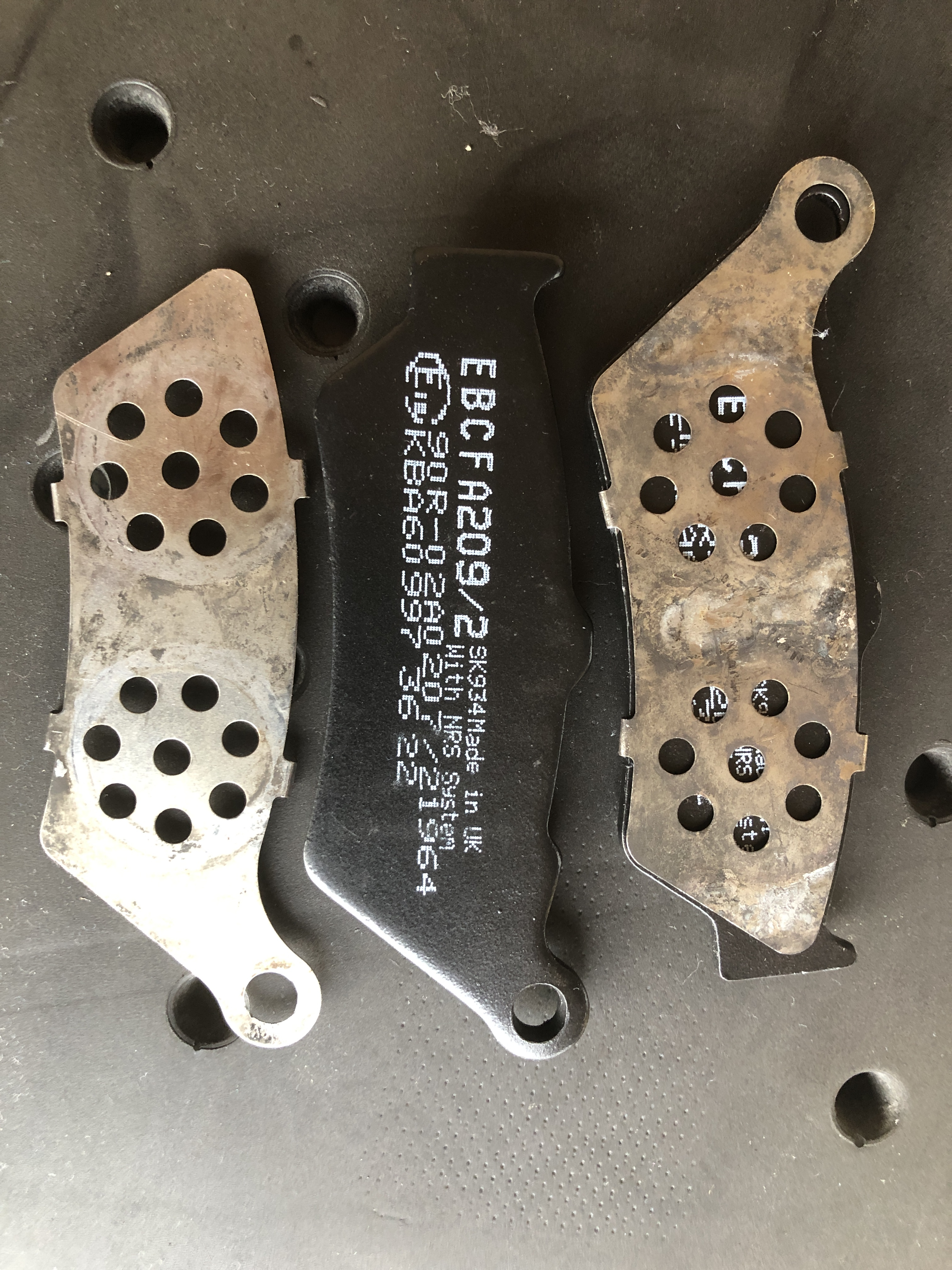 Die originalen Bremsbeläge bei meiner S hatten einen aufgeklippsten Blechrücken, den ich beim letzten (zweiten) Wechsel vor gerade 3000km mit den alten Belägen in den Mülleimer in Garagingen geworfen hatte. Die ganzen letzten 3000km hatte ich Schwierigkeiten mit der Vorderbremse, sie löste oft nicht richtig, machte Geräusche beim Bremsen, völlig ungewohntes Verhalten. Und siehe da, sie sind schon wieder so gut wie ganz am Ende