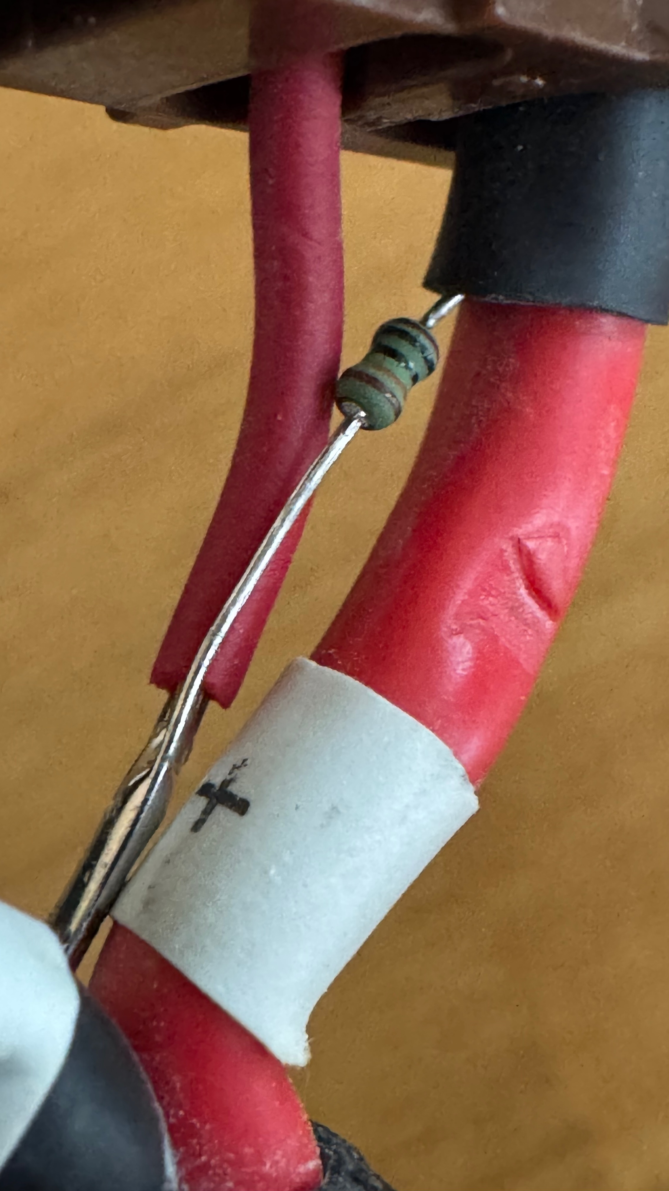 Es muss ein Widerstand von 100kOhm sein zwischen Haupt-Plus pin und dem kleinen Pin in der Mitte. Es sieht auf deinem unteren Bild so aus, als könnte das so verschaltet sein, nur kann ich mir nicht so ganz den Isolierbandzipfel erklären. Dort SOLLTE dieser 100KOhm Widerstand drin sein...