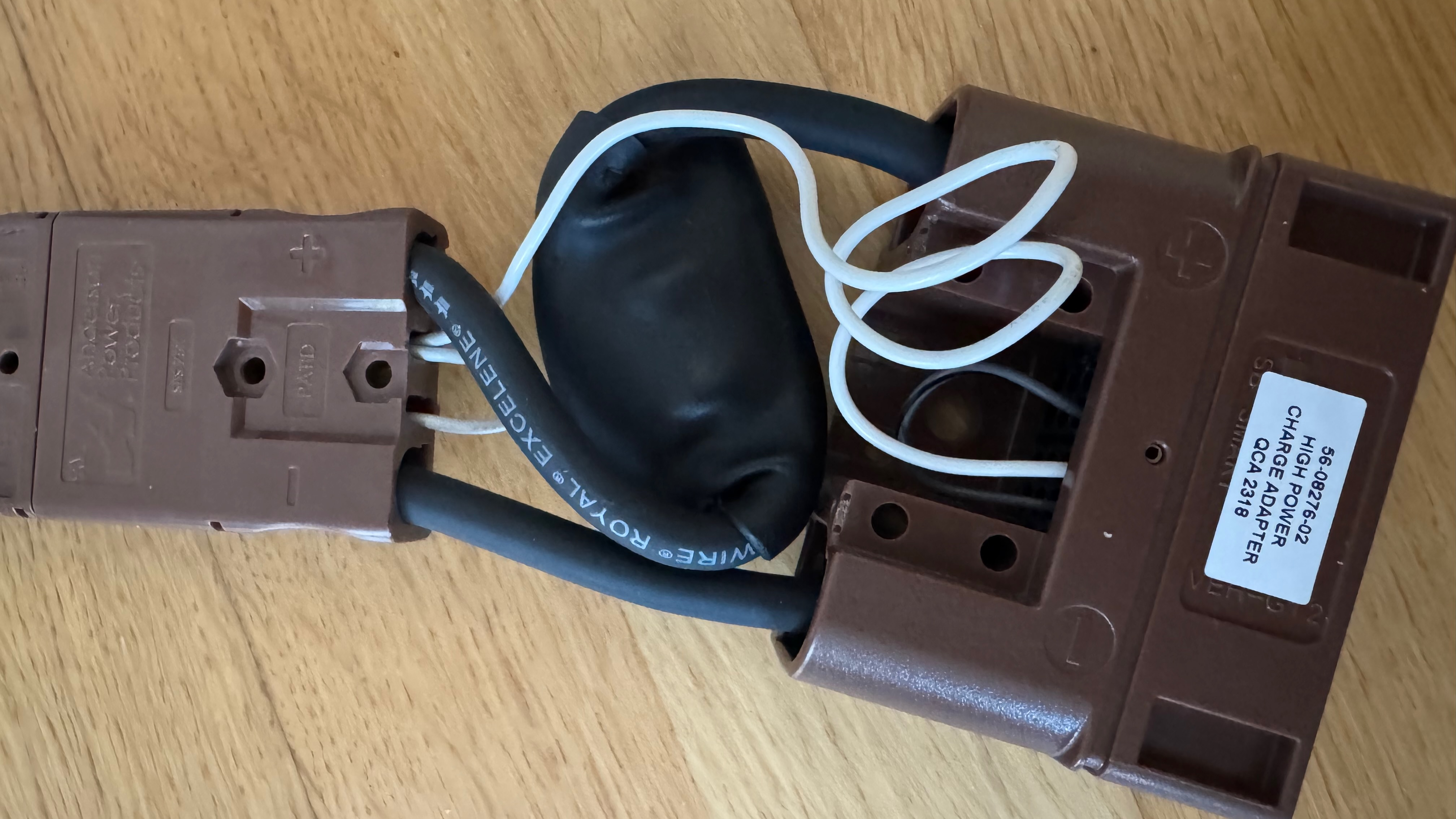 Ist auch drin... Habe den Schrumpfschlauch vorsichtig abgezogen, darunter verbirgt sich der Widerstand. Also habe ich auch mal den Adapter geöffnet: Man sieht die Sicherung in der Plus-Leitung. Das weiße Kabel verbindet den Signalpin (100kΩ) vom Lader mit dem oberen einzelnen Pin vom Batterie-Stecker, und ich konnte mit einem Multimeter da wirklich 100kΩ zu Plus messen. (Das graue Kabel verbindet die beiden unteren Pins.)MEroller hat geschrieben: ↑Di 12. Aug 2025, 17:59Es muss ein Widerstand von 100kOhm sein zwischen Haupt-Plus pin und dem kleinen Pin in der Mitte. Es sieht auf deinem unteren Bild so aus, als könnte das so verschaltet sein, nur kann ich mir nicht so ganz den Isolierbandzipfel erklären. Dort SOLLTE dieser 100KOhm Widerstand drin sein...