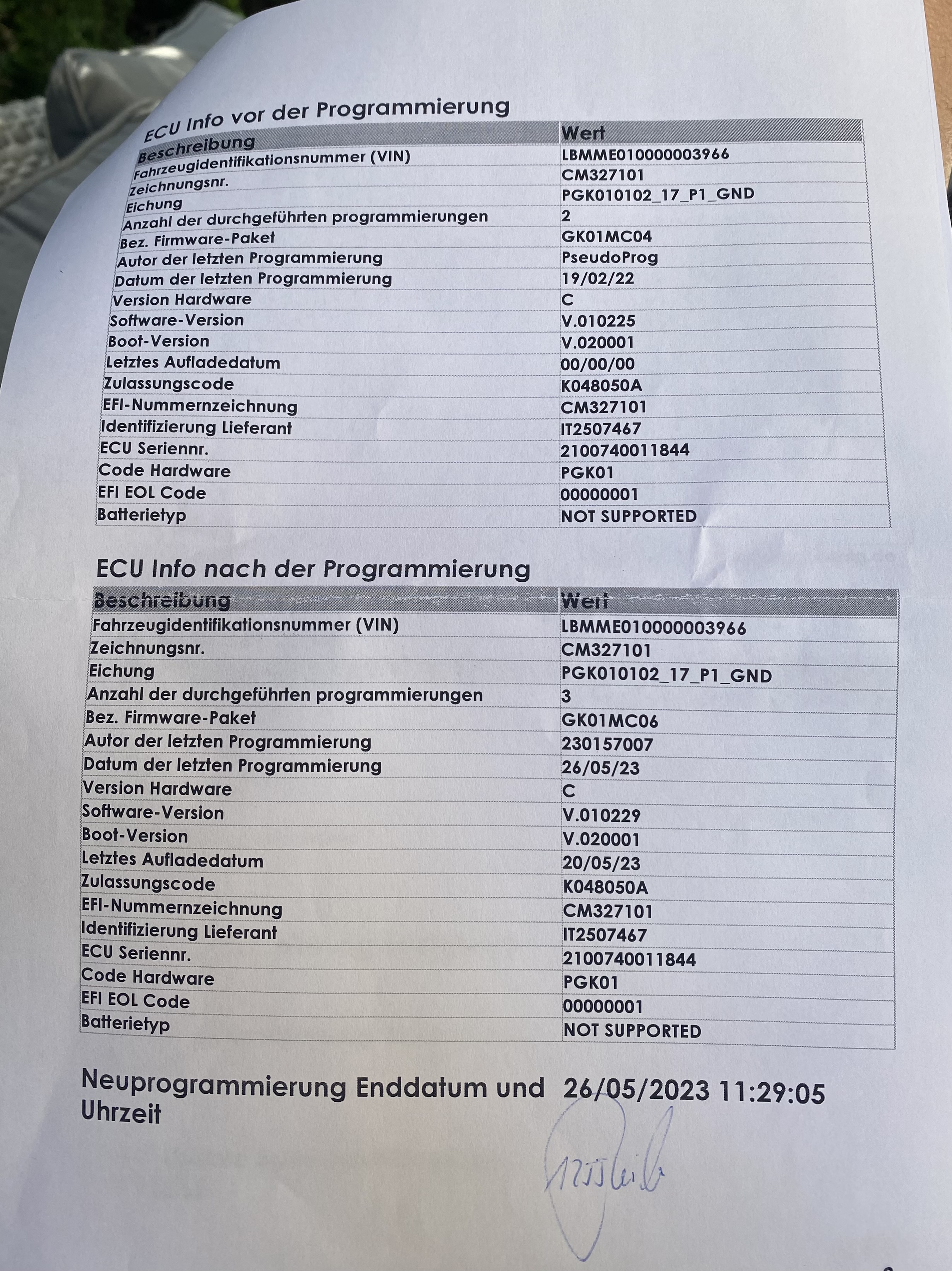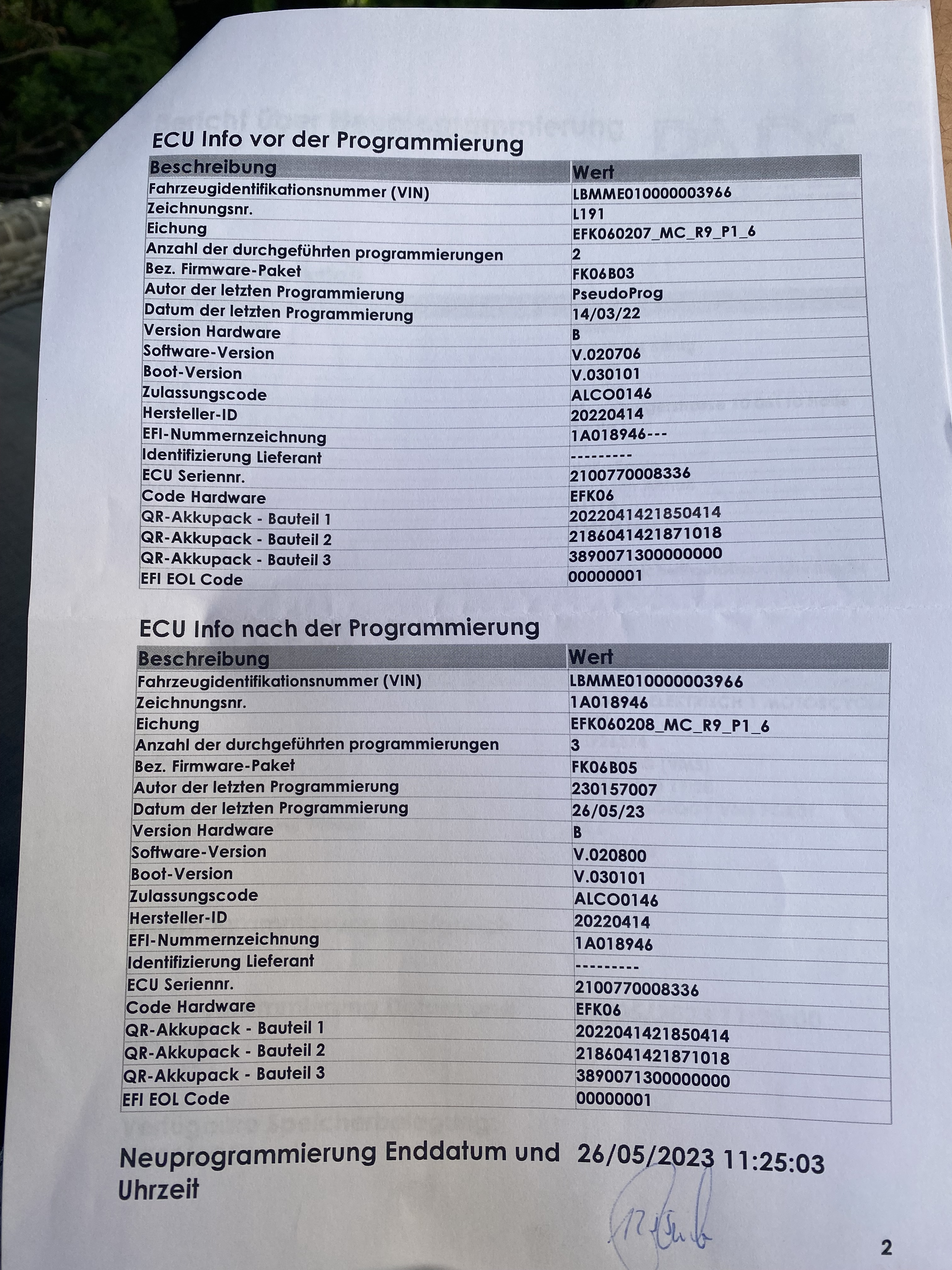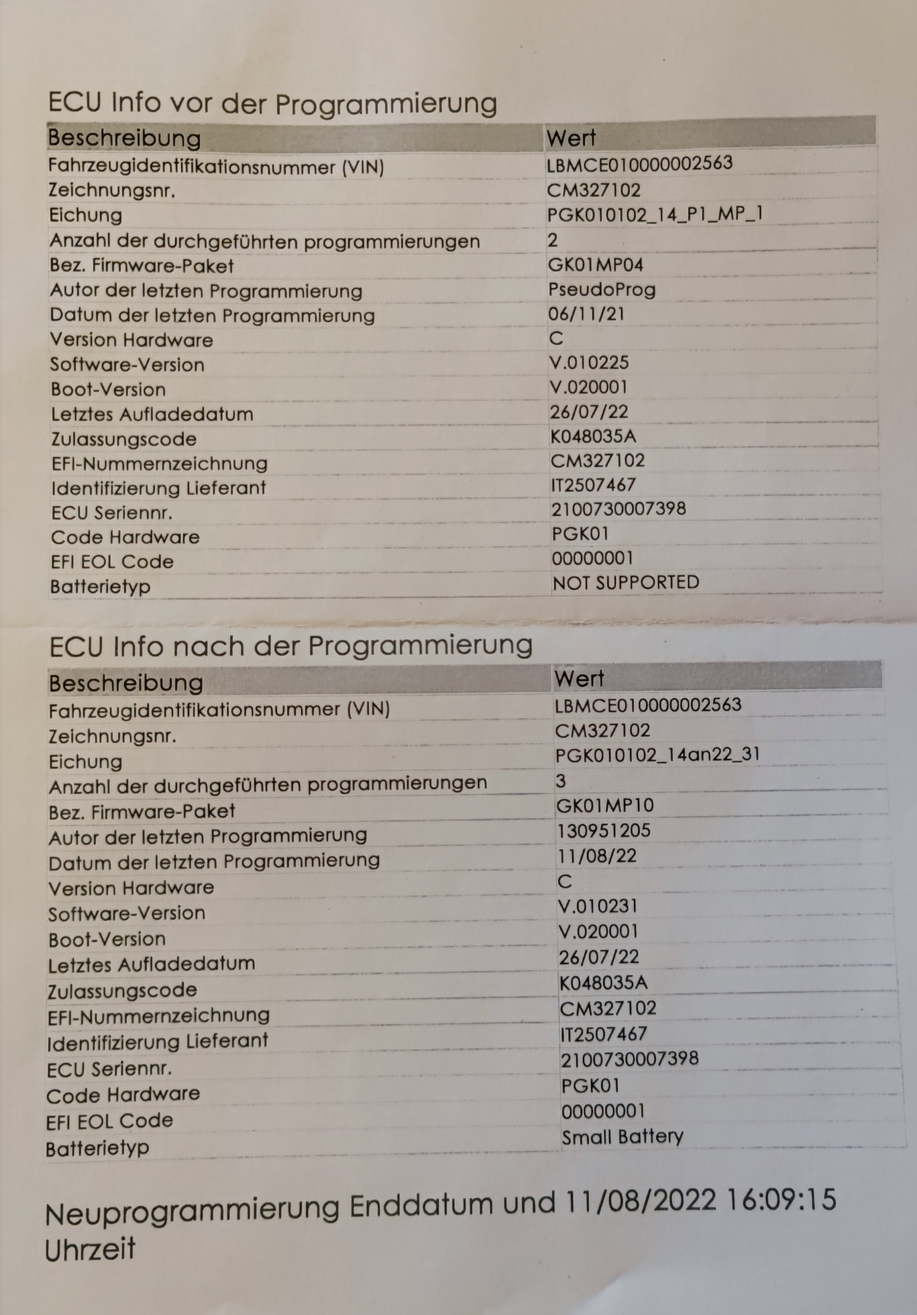hier mal der Ausdruck den ich beim Update mitbekommen habe. Vielleicht helfen die Versionsnummern um Schlauer zu werden ob mein Update das neuste ist. Wobei die Werkstatt ja nicht viel machen kann, die machen den Roller an den PC und sehen sie ob es was Neues gibt.