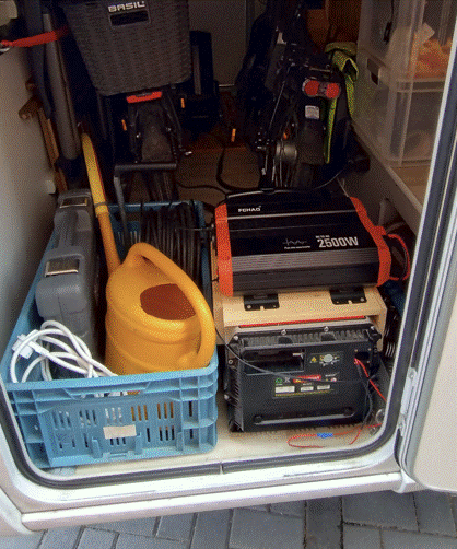 Habe das Powerpack jetzt mal soweit fertig, dass es mit auf Reise gehen kann .. Platz ist hinten in der Garage (s. Foto) .. kann eigentlich rund 40 cm höher stehen und nach Rechts .. dann bleibt der Laderaum frei, es geht aber auch jetzt alles rein und raus.