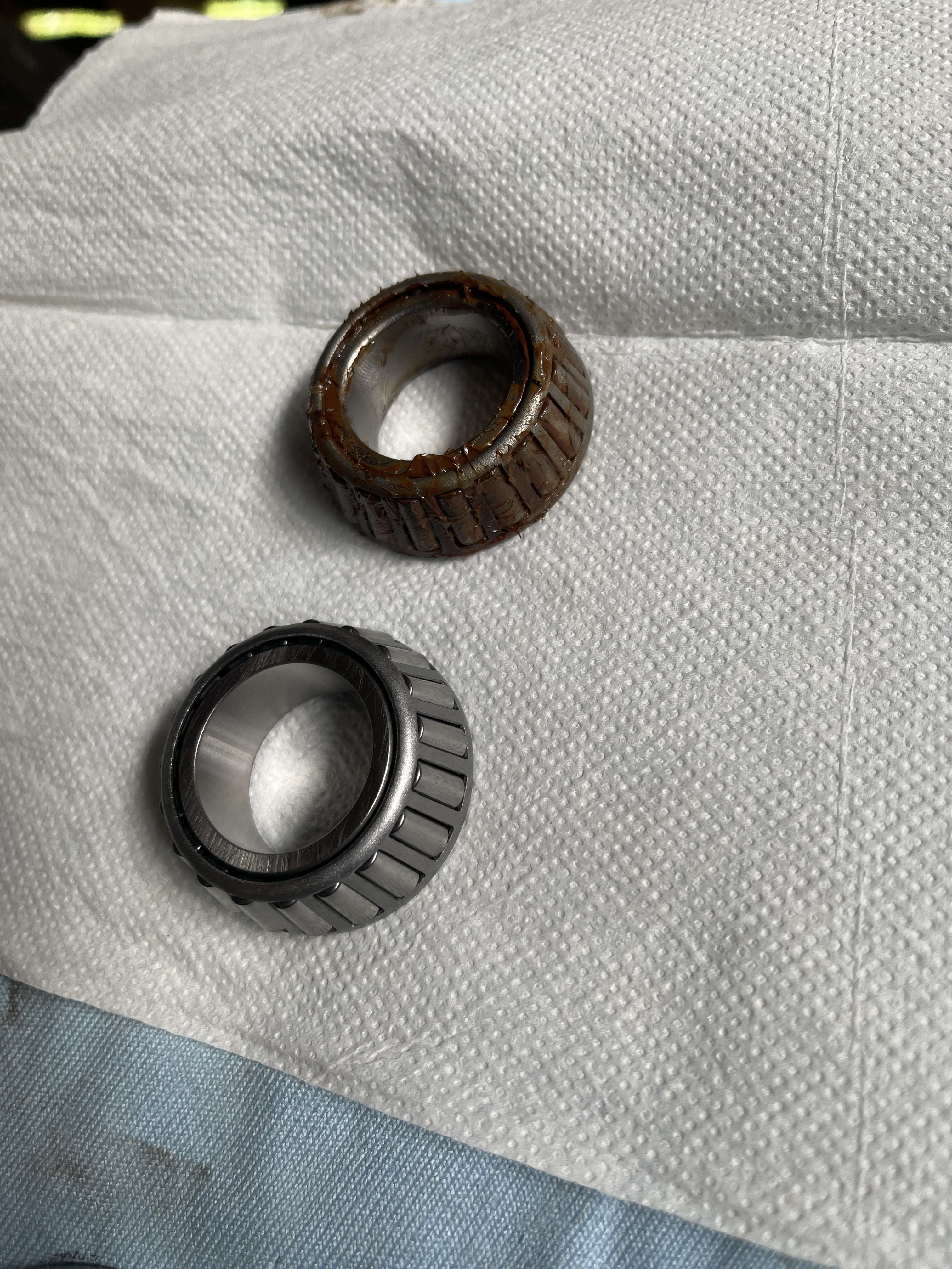 Die meiste Zeit braucht das Entfernen der Verkleidung. Dabei sollte man sich genau merken wohin welche Schraube gehört. Habe mir beide Lager neu gekauft (NTN). Aber es musste nur das obere getauscht werden. Die Lagerschale war auch noch wie neu. Das Lager selber (siehe Fotos) muss wohl Wasser abbekommen haben. Es lag in einer Schmiere aus Wasser, Rost und Fett. Alles gründlich gereinigt und neu gefettet mit "Super Long Term Grease" welches Wasserabweisende ist.