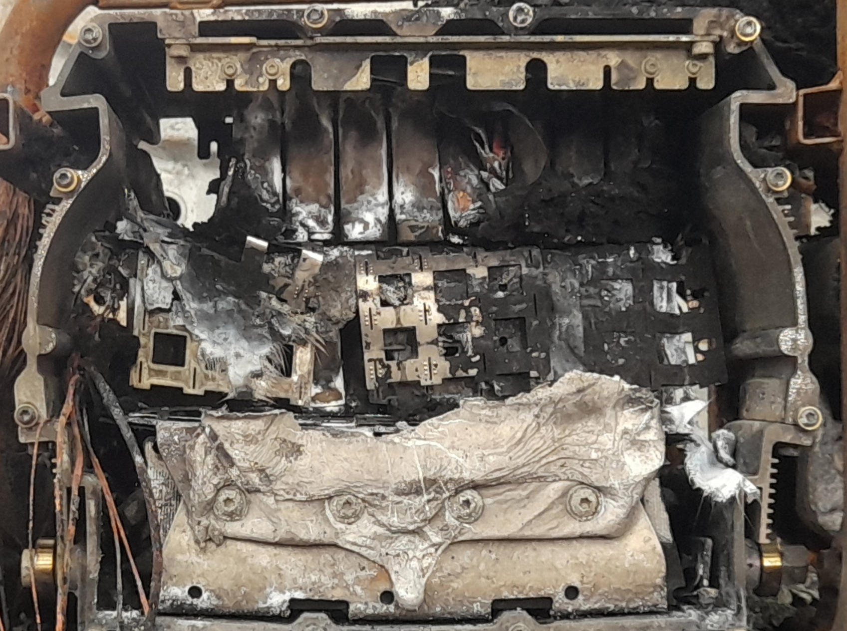 Ich hatte mich bei den ersten Bildern über die herumhängenden Zellverbinder gewundert. Erklärung: da hat sich ein Block aus 11x3 Zellen "vaporisiert". Die Verbinder sind wohl blank weil sie ursprünglich nickelbeschichtet waren. Darunter kann man die Reste der geschmolzenen Zellbecher erkennen.