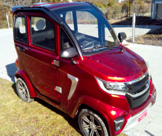 4-rad Kabinenroller, 2 Sitze hintereinander, Höchstgeschwindigkeit 45 km/h, Reichweite ca. 100 km, Akku LiFeP04 72V/70 Ah, Gesamtgewicht mit Batterien 360 KG