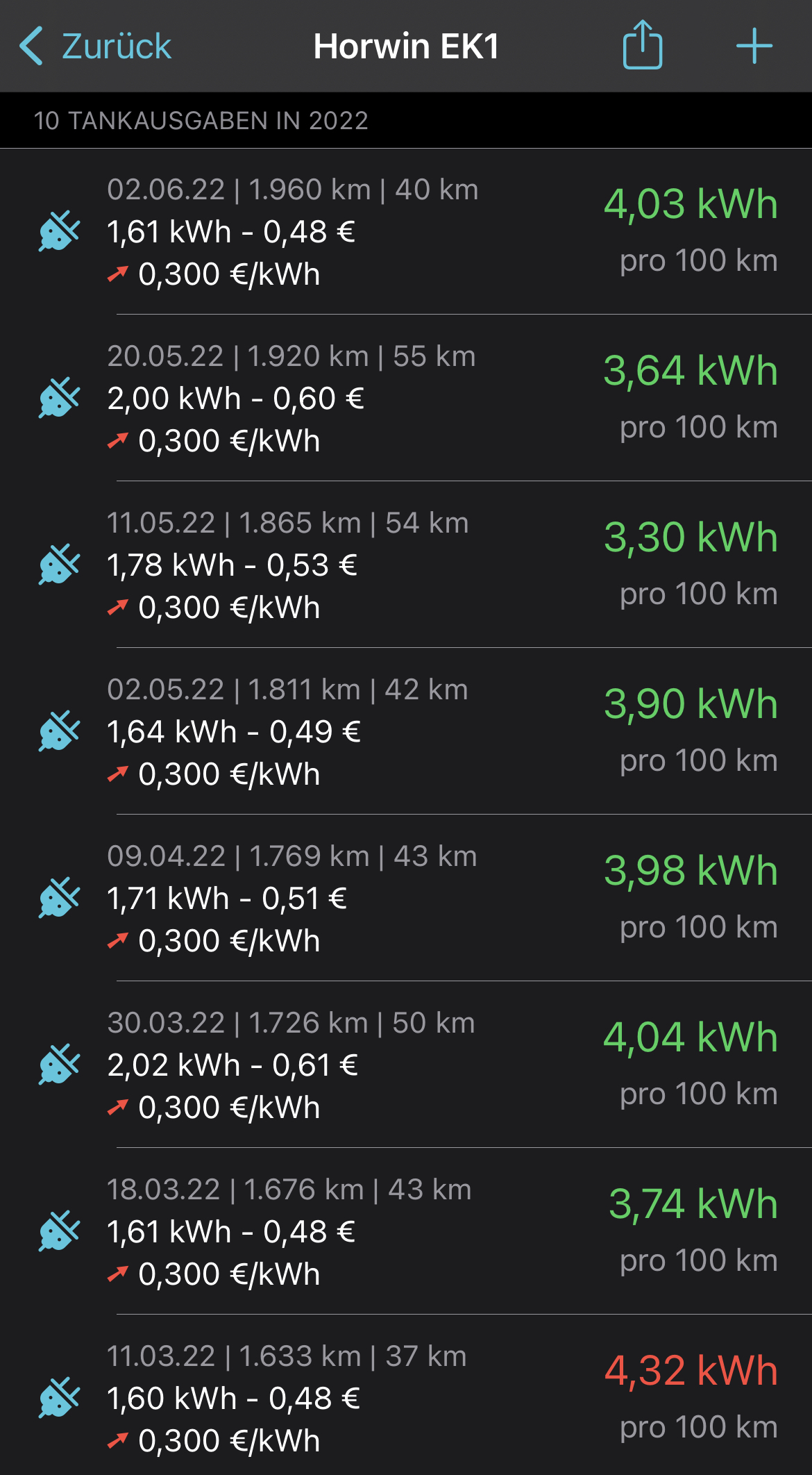 Im Anhang dazu auch mal die letzten Ladevorgänge. Der aktuelle zeigt den Verbrauch unlocked… da um 4kW auf 100km … Normalmodus um 3,3kW auf 100km … macht schon einen Unterschied… aber eben auch gut durchzug