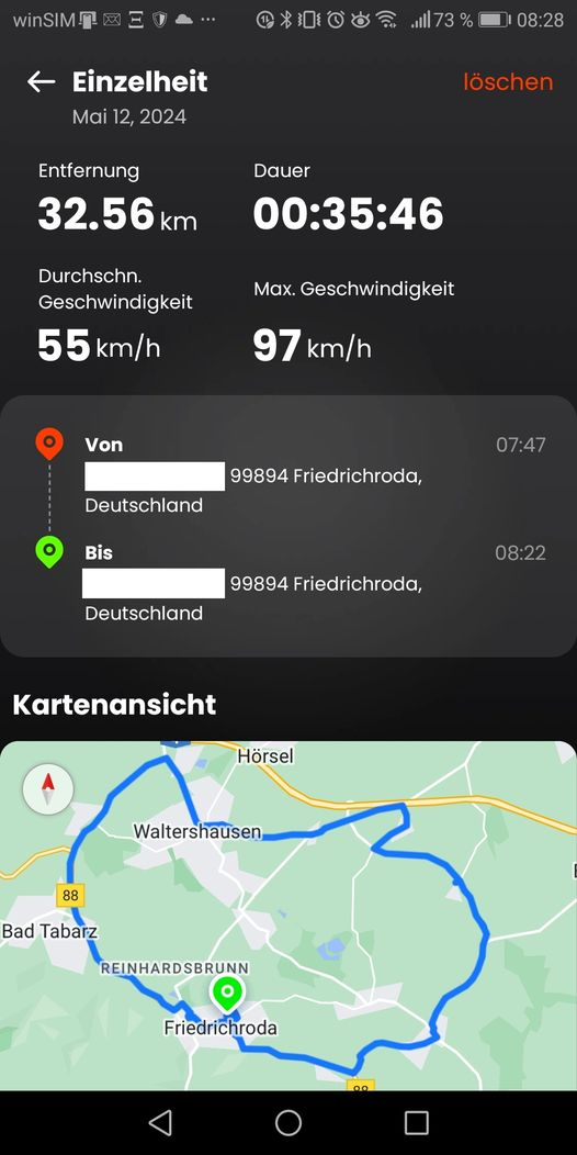 Geschwindigkeit: 102km/h laut Tacho (leicht bergab) ... in App (Digital Dashboard) Höchstgeschwindigkeit 100,6 km/h ... leider hat er Route nicht aufgezeichnet bzw. gespeichert. Ich teste es mal mit der empfohlenen App, wenn ich das nächste mal fahre.