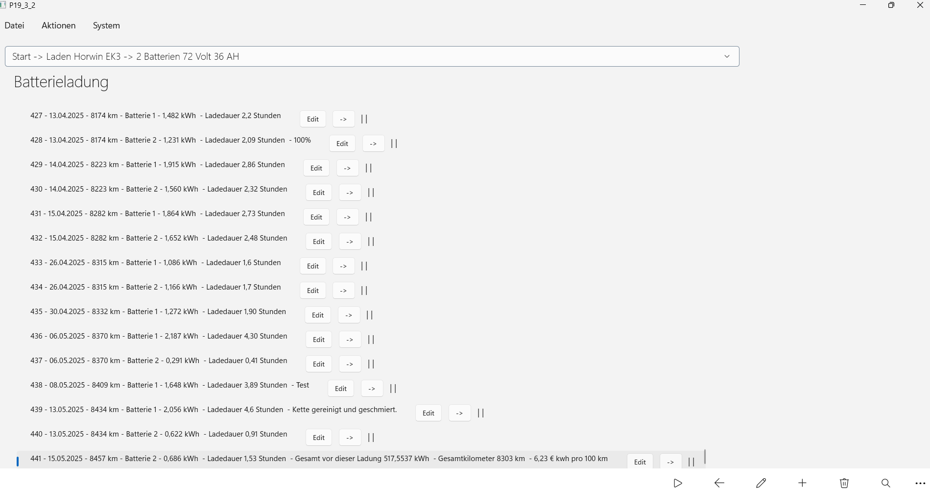 Ebenso trage ich Wartungen wie z.B. für die Kette oder Luftdruck kontrollieren und Reparaturen dort ein. Und auch wann der Akku balanciert wurde. (Für mich heißt das solange geladen bis die Stromaufnahme unter 10 Watt liegt. Dann schreibe ich 100% in die Bemerkungen. Es wird jetzt Zeit beide Akkus wieder zu balancieren. Ich meine einmal im Monat sollte es sein.)