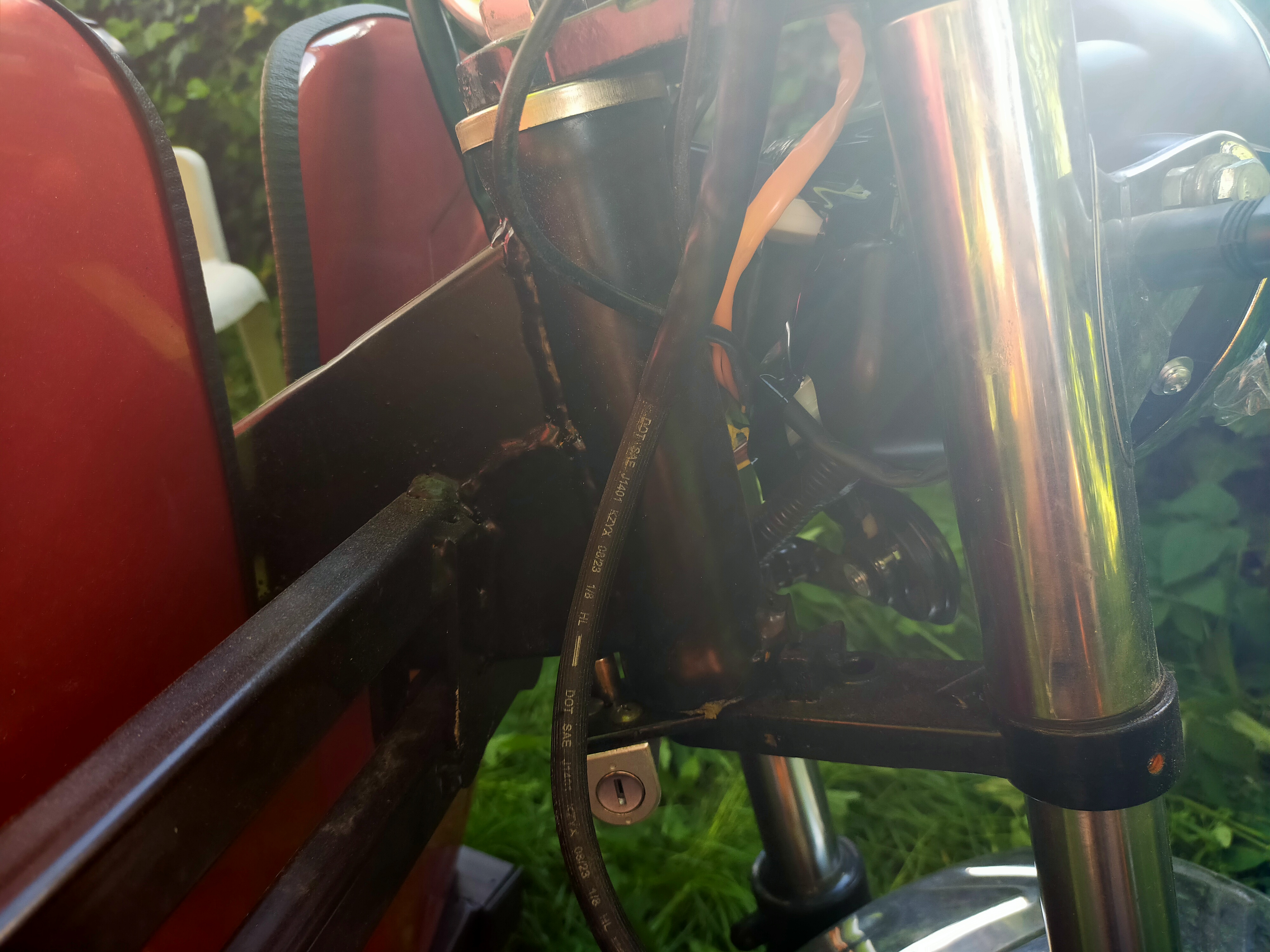 Wichtig: auf dem Fahrersitz sitzend, sieht man, das vor der Lampe ein großes Loch ist; dort sind Stecker, einer so befindlich, das das Regenwasser zum Kurzschluß der blanken Kabel führen würde. Ich habe das große Loch mittels sich überlappender Isolierbandbahnen verschlossen, so das kein Wasser mehr eindringen könnte. Zuvor Kabel - Stecker mittels Isolierband zugewickelt.