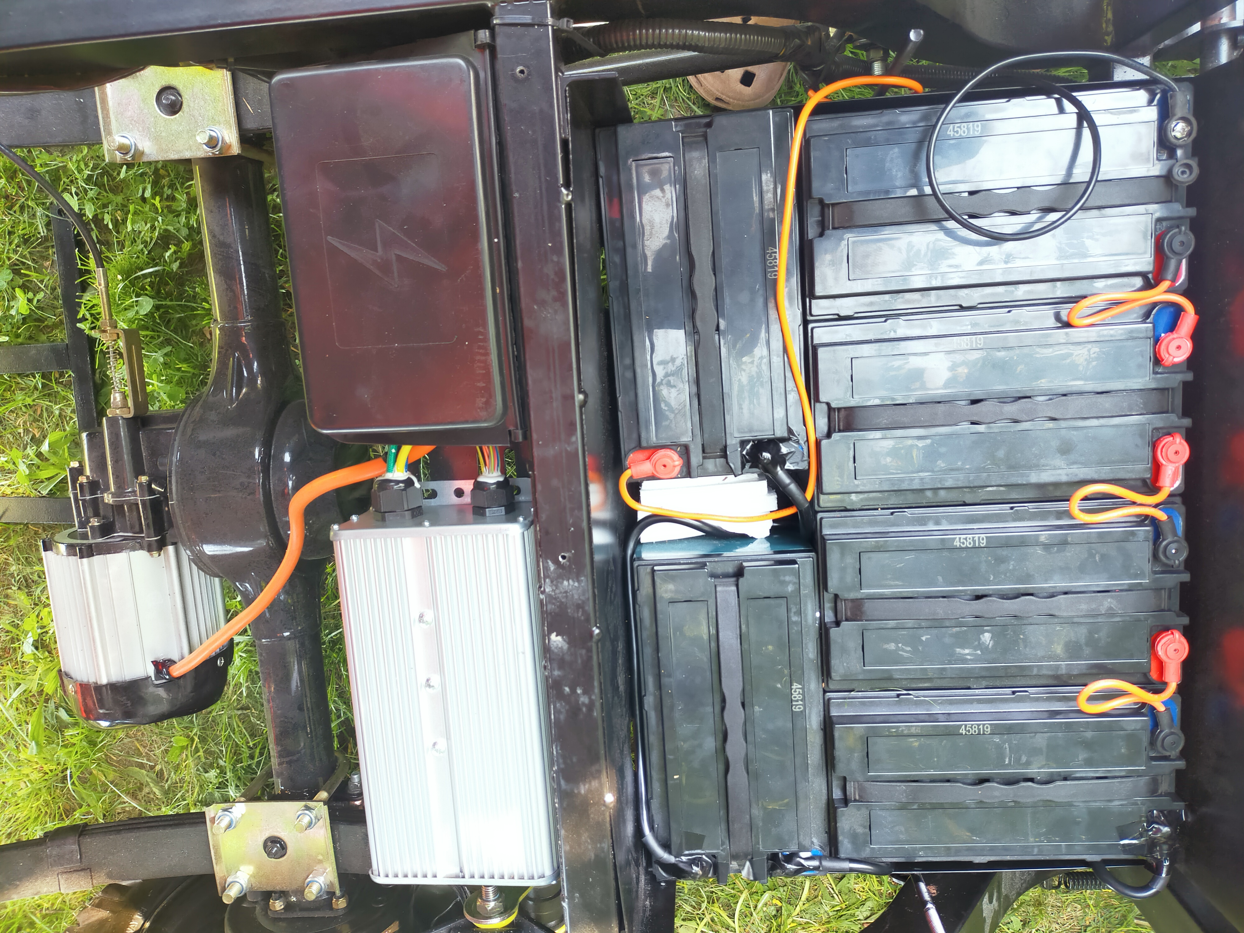 Jetzt ist es dunkel geworden, ich habe es zeitlich bis jetzt gerade geschafft, die zusätzlichen 6 Stück 12 V 20 Ah Bleigelbatterien einzubauen. Ich verkabelte sie zu einem String mit 72 V 20 Ah und klemmte den String parallel zu den original im VT5 befindlichen 6 Stück 12 V 60 Ah K20 Bleigelbatterien. ( 72 V 60 Ah - vermutlich nur echte 40 Ah ). Das Batteriefach ist jetzt total plan ausgefüllt - siehe Foto. Das zweite Foto zeigt die von mir wieder aufgeschraubte Batterieabdeckplatte. Zuvor mußte ich zwei sich im Batteriekasten befindlichen Streben einkürzen mittels Eisensäge, Hammer und sehr großen Rohrzange. Die Streben sind nur aus Schmiedeeisen, es ist kein Stahl und läßt sich somit relativ leicht bearbeiten. Somit ist jetzt der VT5 mit einer angeblichen Nennkapazität von 80 Ah (vermutlich nur 60 reale Ah) Bleigel Akkubank mit 72 V ausgestattet. Ich warte schon ungeduldig auf den 1. Juni - Versicherungsbeginn, um eine Probefahrt machen zu dürfen.