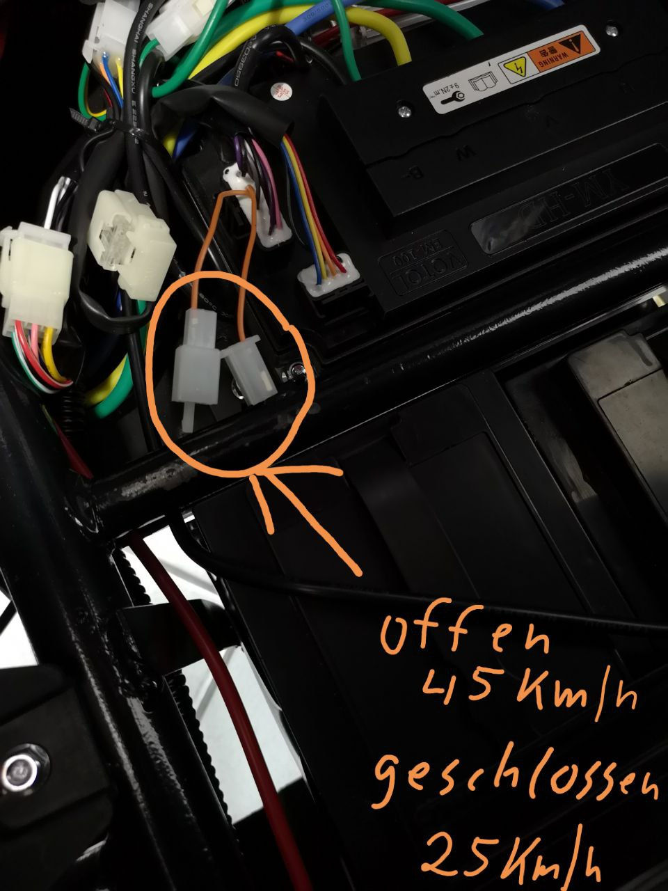 Auf dem Bild ist das Steuergerät. Dort befinden sich 2 orangene Kabel mit weißen oder schwarzen Stecker. Sind die Stecker auseinander, wie auf dem Foto zu sehen ist, fährt der Roller 45 km/h. Steck man die zusammen, ist der gedrosselt.