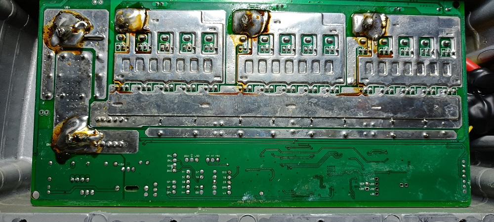 Im Vergleich zu den Anschlusskabeln ist der Querschnitt deutlich geringer und da meist initial nur ein FET "stirbt" geht hier die komplette Leistung drüber.
