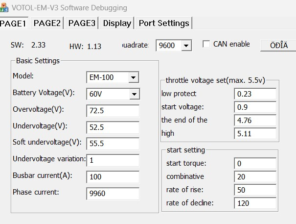 Du könntest noch messen, wie die Gaspedal-Einstellung ist. Auf Page 1 der Votol-Software muss der Regelbereich eingestellt werden, indem die Spannung bei der Gas-Betätigung liegt: