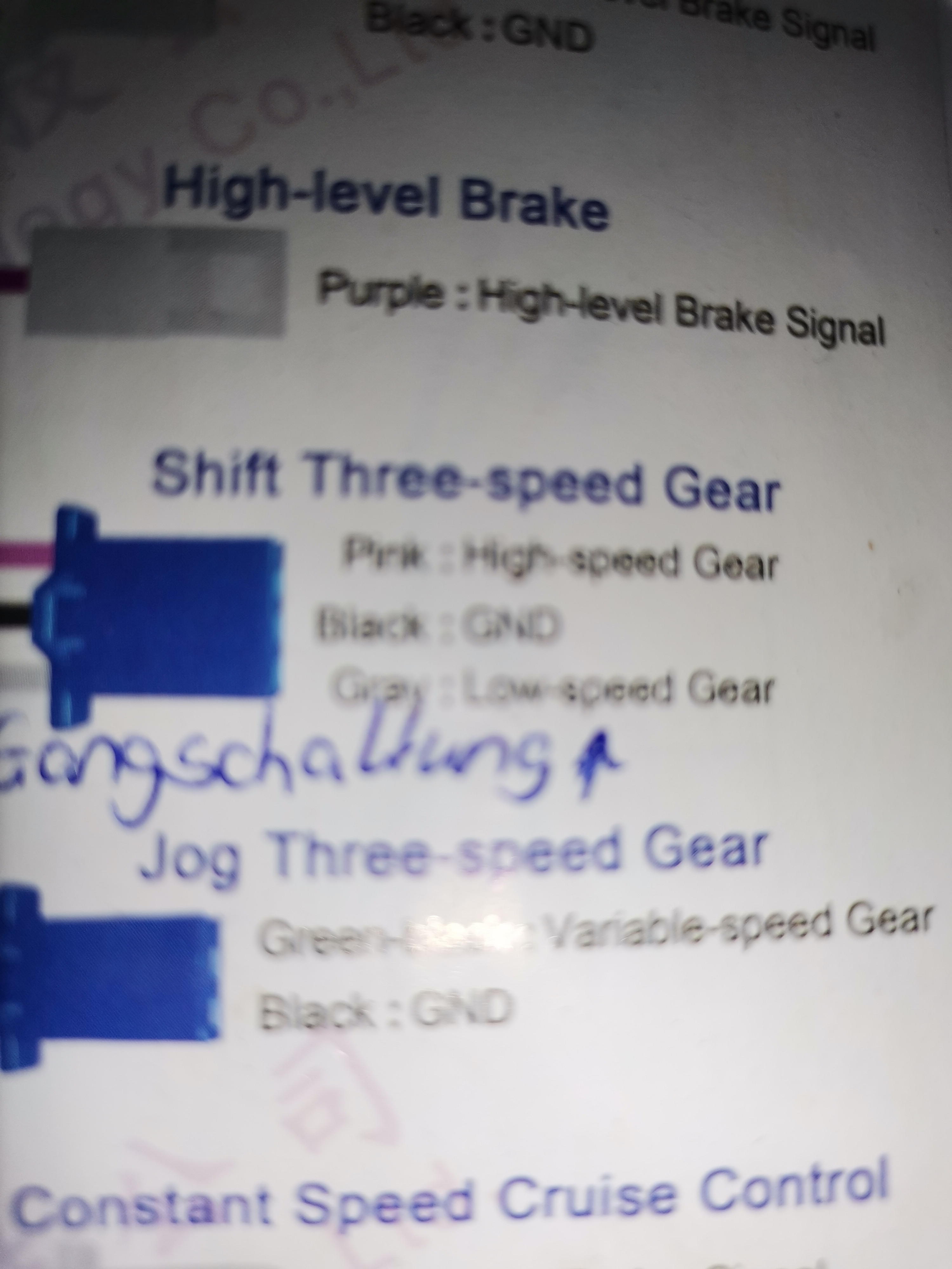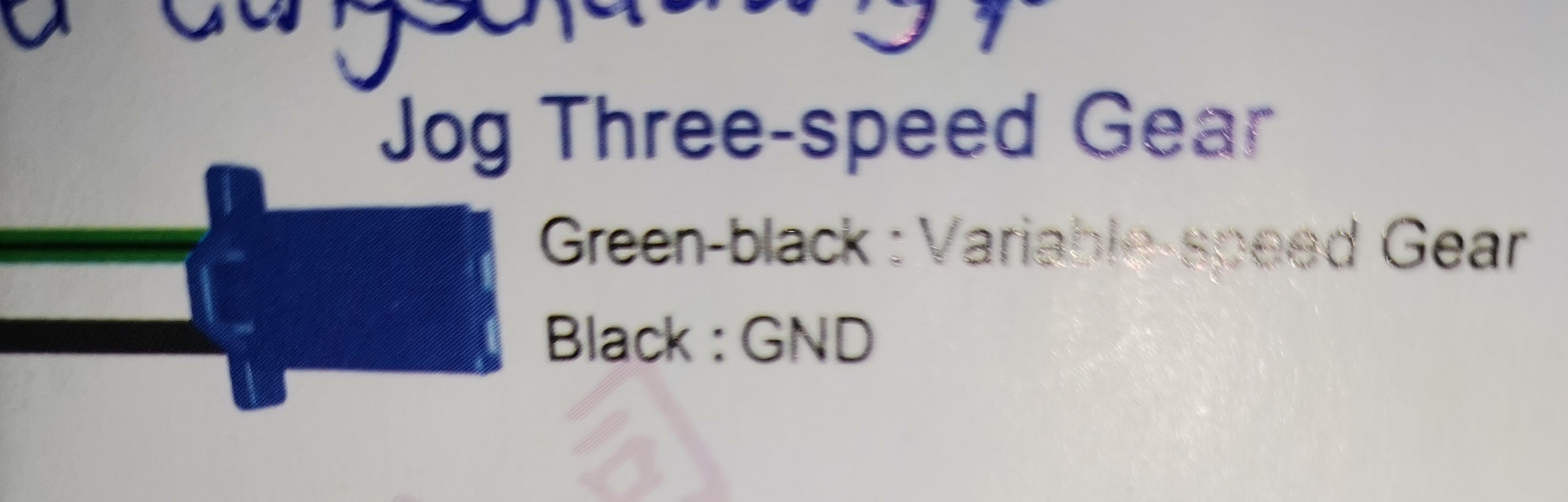 das müsste die 1 - 2 - 3 - 2 -1 Umschaltung der Fahrstufen sein. Da gehört dann ein Taster an die beiden Kabel und jeder Kontakt der Steuerleitung (var speed gear) zu GND/Minus schaltet eine Fahrstufe weiter Treppe hoch oder Treppe hinunter.