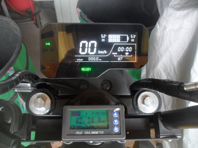 um mir mal einen besseren Überblick über einige elektrischen Werte zu verschaffen habe ich mir ein Coulombmeter an die Super Miku angebaut (Stromsensor misst die Summe beider Akkuströme). Bei einem Test auf einer Strecke mit bis zu 12 % Steigung bzw. Gefälle habe ich (einsitzig, ca.85 kg) da folgende Werte gemessen. Nimmt sich der Motor die volle, mögliche Leistung so entspricht die ca. 5,7 kW bzw. 79 A. Auf der Bergabstrecke und zugeschalteter Rekuperation (ich habe mir da einen Taster nachgerüstet mit dem ich rein elektrisch, also ohne Betätigung der hydraulischen Bremsen bremsen (und damit auch Rekuperieren) kann) sind die Akkus dann mit ca. 1,1 kW bzw. 14 A geladen worden.
