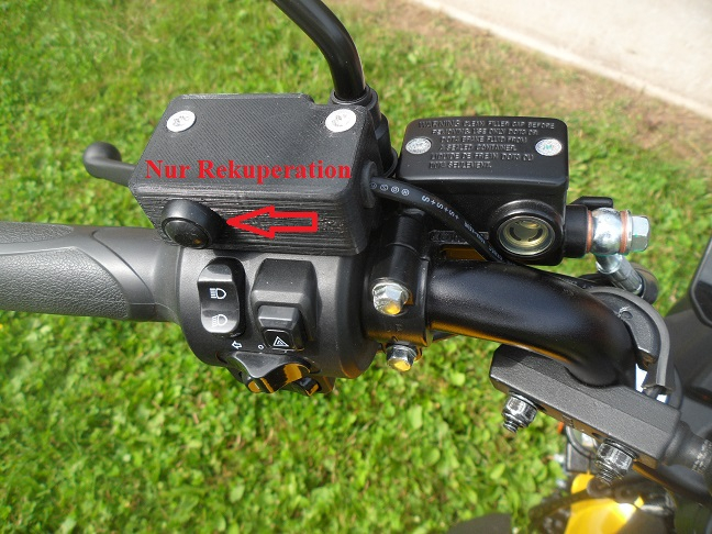 den Rekuperationstaster nachzurüsten war eigentlich relativ einfach, die Umschaltung von Antriebs- auf Brems- Betrieb des Motors erfolgt ja nur durch Betätigen eines der beiden Bremshebelschalter und dabei wird dann auch noch das Bremslicht aktiviert. Dementsprechend habe ich mir am Kabelendeende des linken Bremshebelschalters einen Abgriff drangemacht (ich konnte leider die originalen nicht eindeutig identifizieren, sonnt hätte ich mir ein Y-Kabel gemacht) und da halt einen Taster angeschlossen. Das ganze funktioniert auch sehr gut, nur wäre es halt schön wenn die Brems- und damit auch Rekuperations Wirkung deutlich höher wäre. Das Gehäuse für den Taster habe ich mir gedruckt (und könnte die entsprechenden Dateien auch gerne zur Verfügung stellen, müsste nur wissen in welchem Format und über welche Übermittlungsmethode), der Taster ist ein PBS-33B, den man über verschiedene Quellen beziehen kann und für die Steckverbingung habe ich einfach welche gewählt die einfach zu bekommen, wasserdicht und günstig sind. Das ganze funktioniert umso besser je vorrausschauender man fährt, wenn ich aber z.B. innerorts mit 50 km/h (oder knapp darüber) unterwegs bin und sehe dass 200m vo mir eine Ampel auf Gelb schaltet reicht die Reku Bremswirkung nicht, da bracht man dann doch die hydraulischen Bremsen dazu (die sind ja unverändert). Bei längeren Gefällestrecken kommt es darauf an wie schnell man dort fahren darf bzw. kann. Bei meinem Test auf der Straße mit bis zu 12 % Gefälle brauchte ich größtenteil gar nicht bremsen weil der Luftwiderstand die Geschwindigkeit bei ca. 70 km/h stabilisiert hat und im letzten und auch steilsten Abschnit waren dann noch 50 km/h erlaubt und da hat die Rekuperation gerade so auf ca. 60 km/h reduziert.