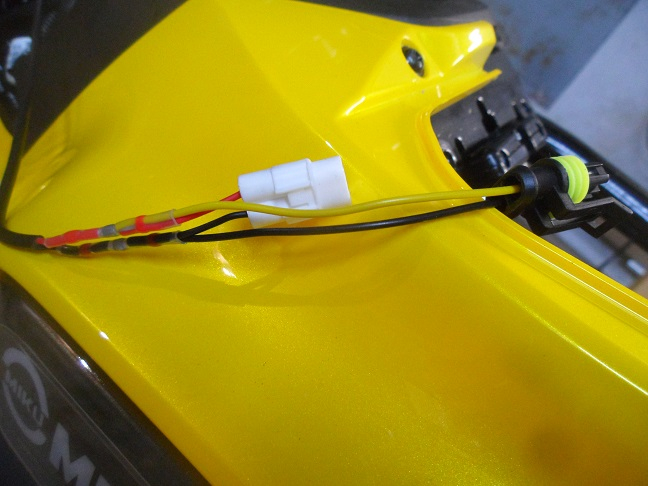 An dem 5 poligen Stecker unter der Sitzbank den ich für die Diagnoseschnittstelle gehalten habe, konnte ich neben 12 V und Masse auf der grauen Ader 2,41 V DC und auf der weißen 2,42 V DC messen was möglicherweise ein Bus Low und Bus Hi sein könnte. Das würde auch zu zwei in den gleichen Farben auf den Controllern aufgelegten Kabeln passen. Ich hätte das auch durchmessen können aber dazu hätte ich erst Verkleidungen abschrauben müssen, deshalb hab ich zunächst mal in Fotos gesucht die ich mal gemacht hatte.