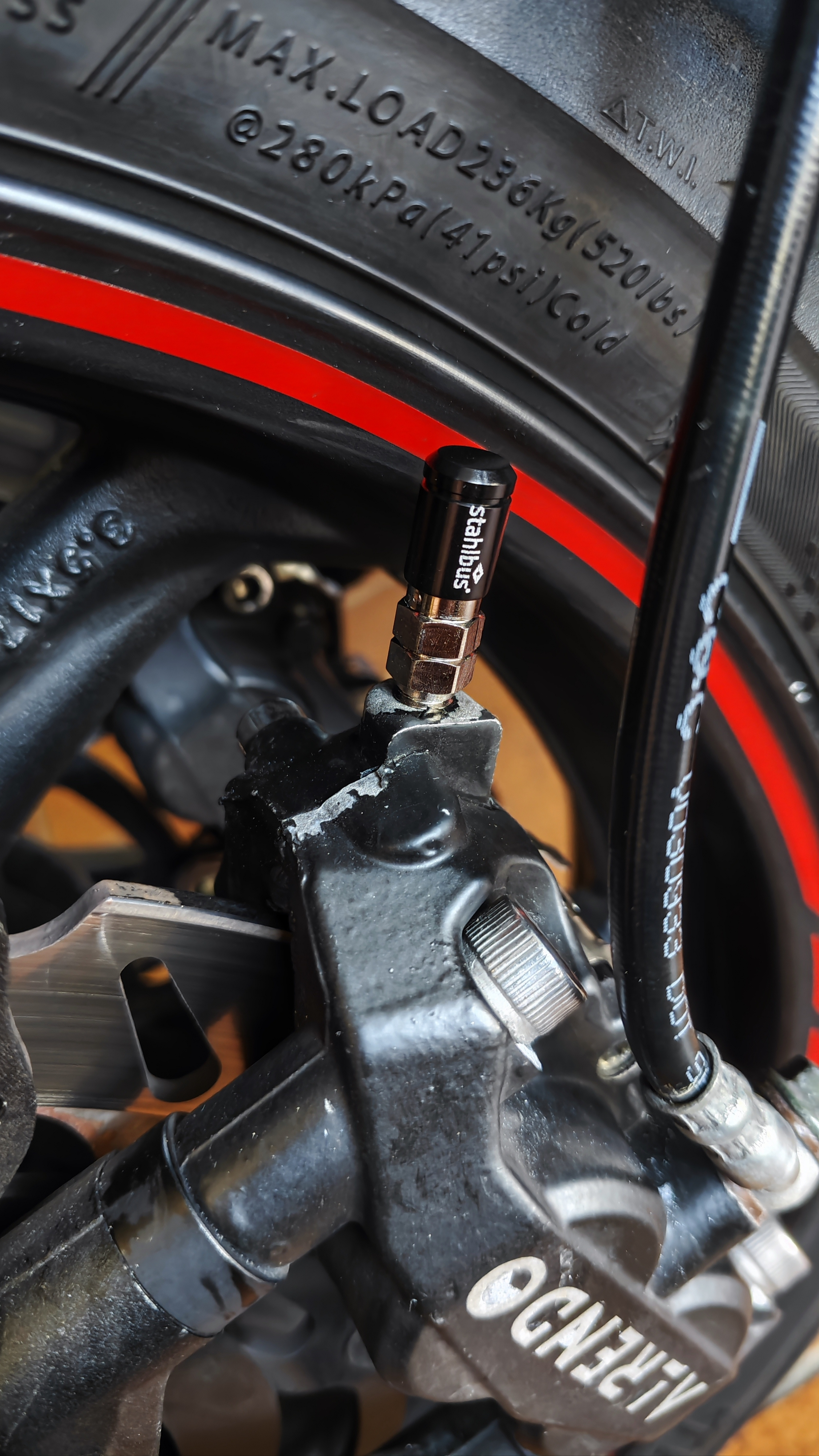 Das entlüften geht damit aber wirklich sehr leicht. 1/2 Umdrehung öffnen, Schlauch mit Auffangbehälter aufstecken und über den Bremshebel langsam pumpen, bis die Luftbläschen raus sind. Dann Ventil schließen und Schlauch entfernen.