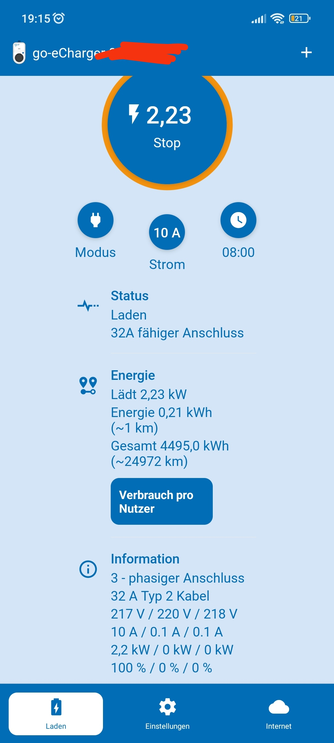 Nachtrag nach 15min : Leider bricht auch da nach einiger Zeit die Wallbox ab. Mal gespannt ob das behoben werden kann