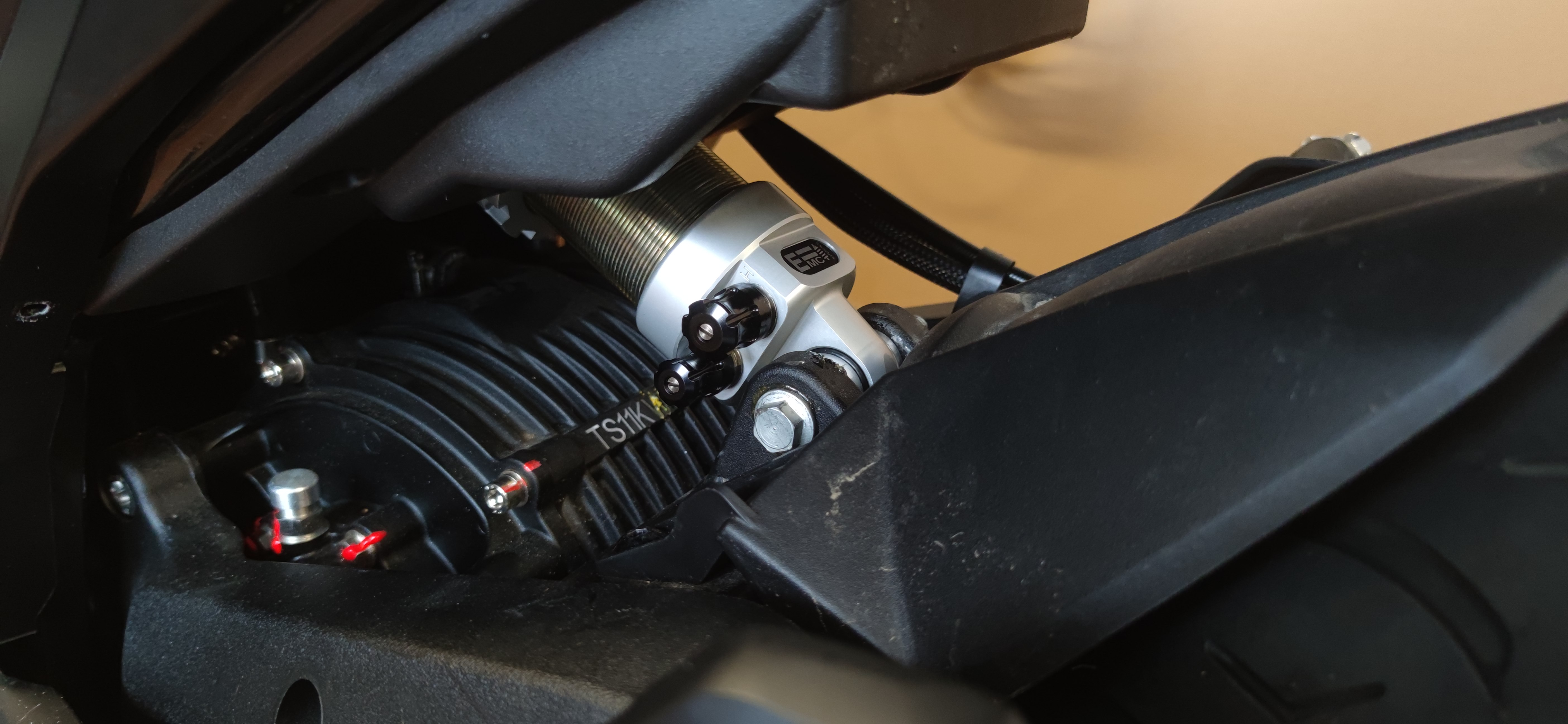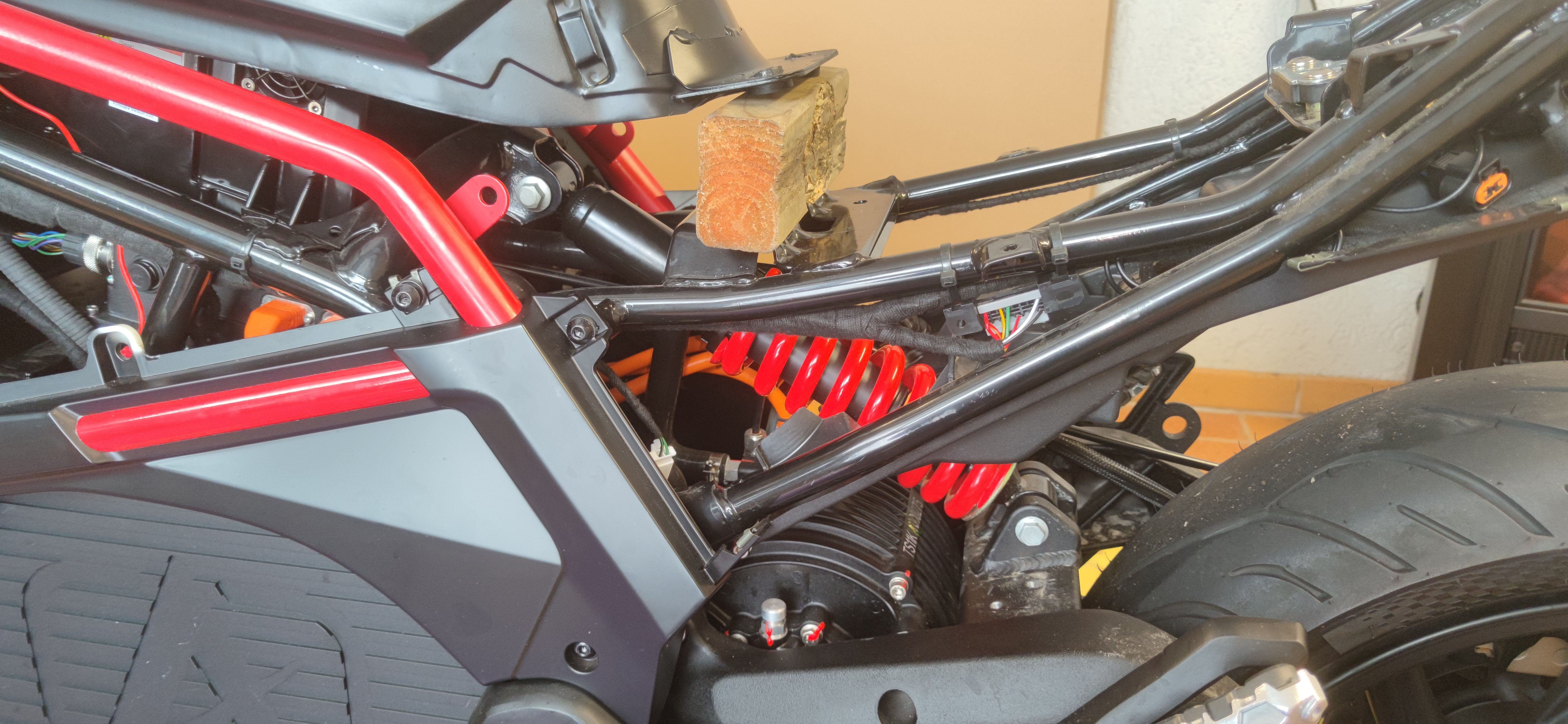 Auf der linken Seite hat das Federbein nur ca. 3mm Abstand zu der Kunststoffabdeckung unter der Sitzbank. Rechts sind es ca. 10-12mm. Man könnte mit einem scharfen Cuttermesser zwar noch etwas wegschneiden, aber muss man nicht zwingend.