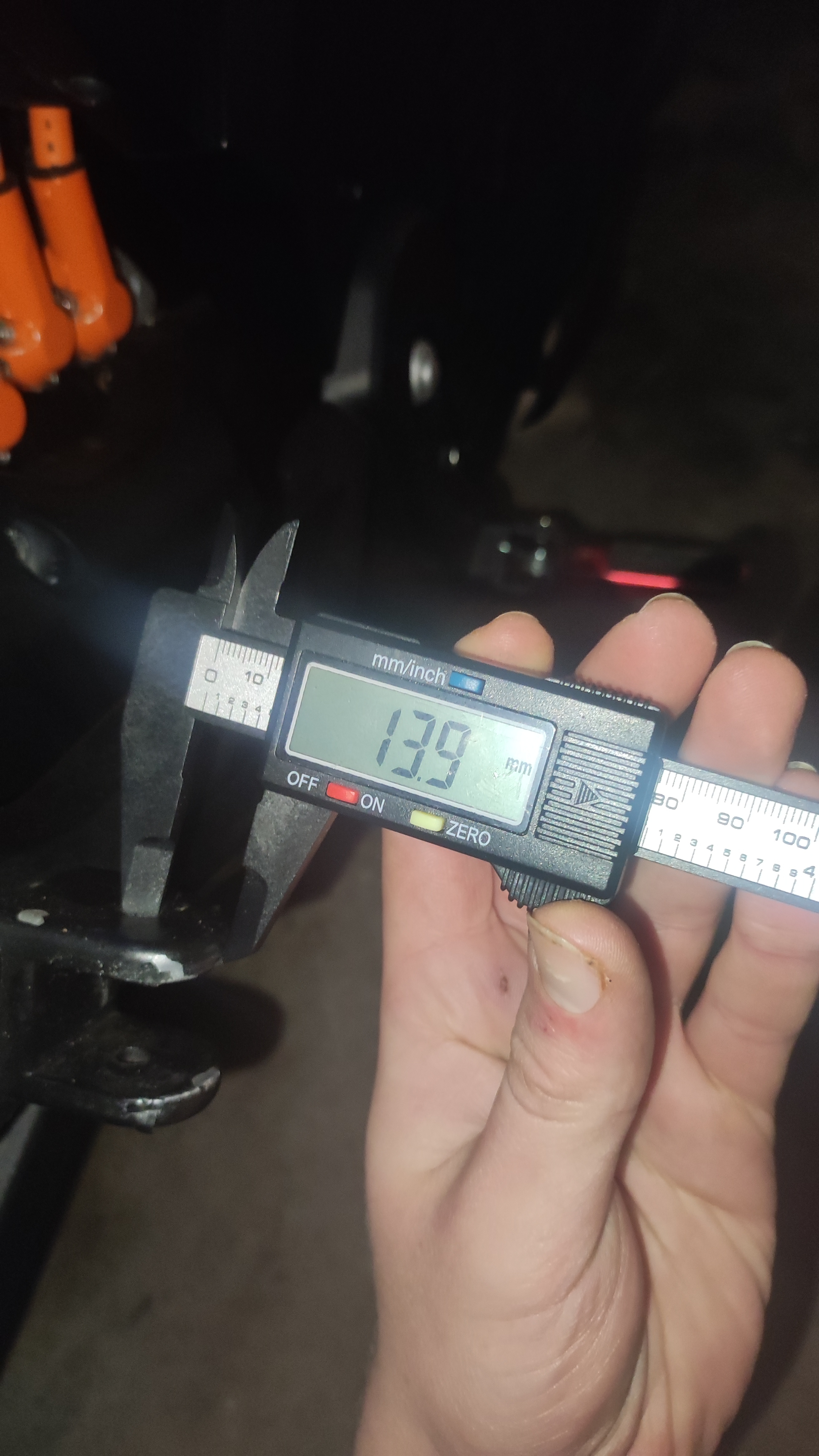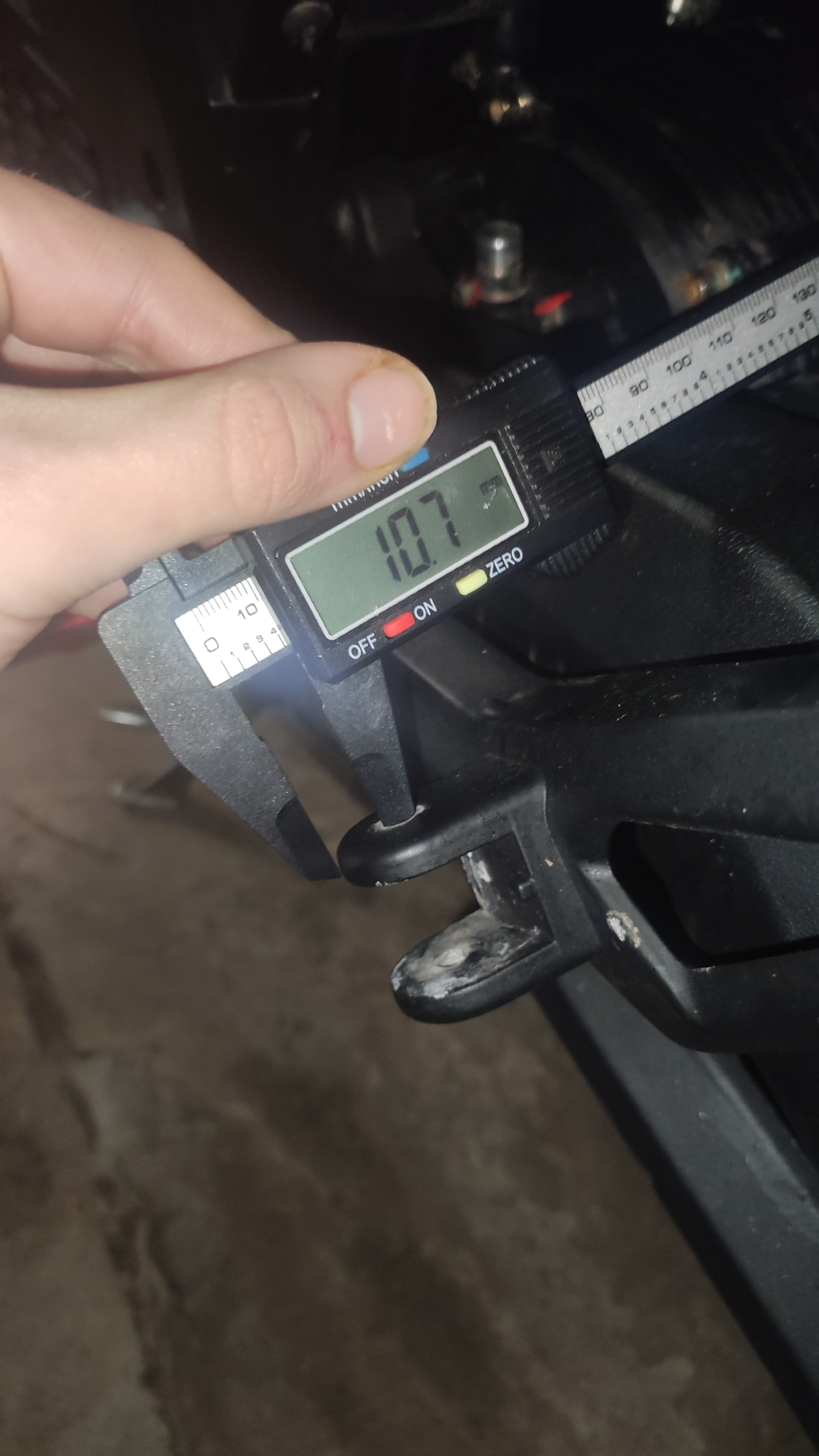 Ohne ausbauen der Fußrasten schwierig zu messen, aber bei mir sind es auf beiden Seiten ca. 8mm von der Außenkante bis an den silbernen Bolzen. Bis Mitte Bolzen/Bohrloch ca. 13mm.