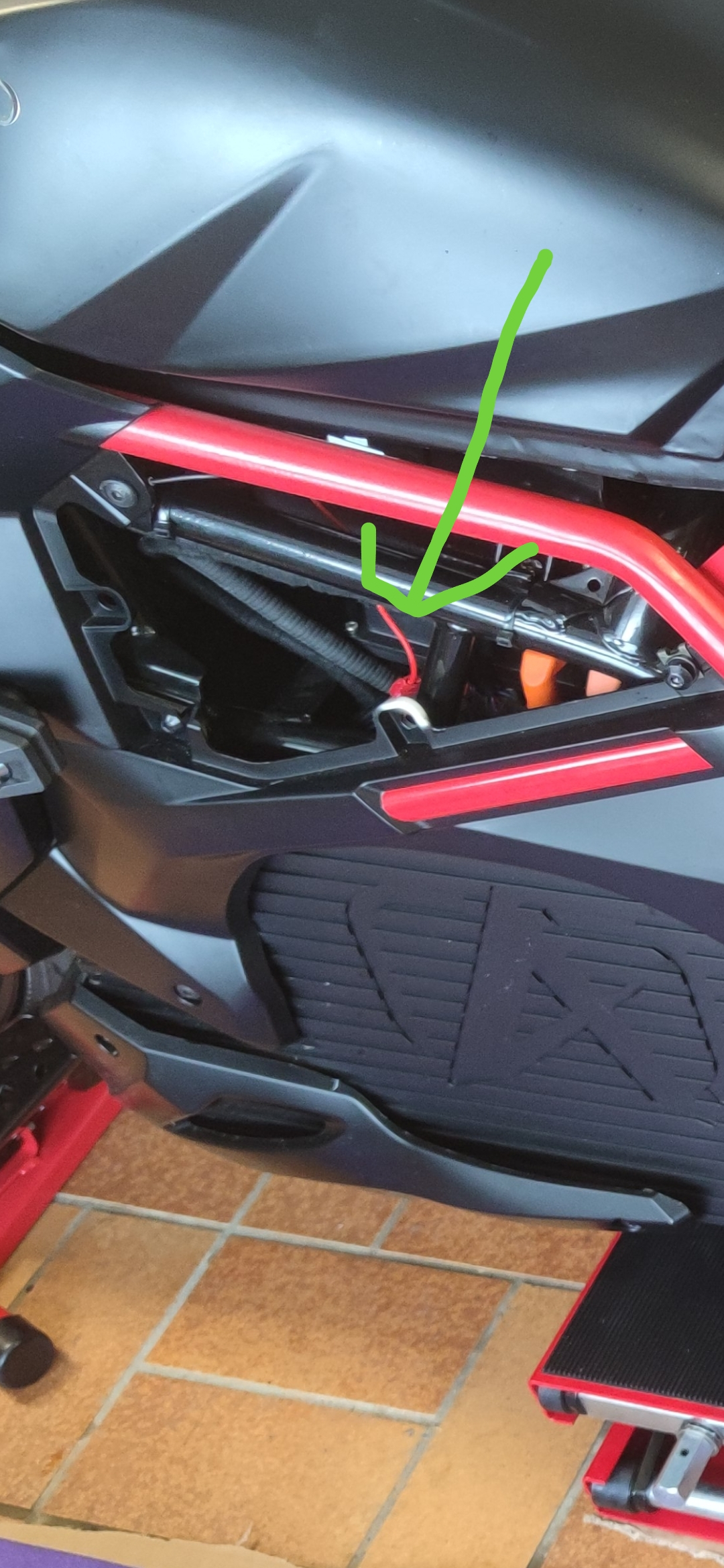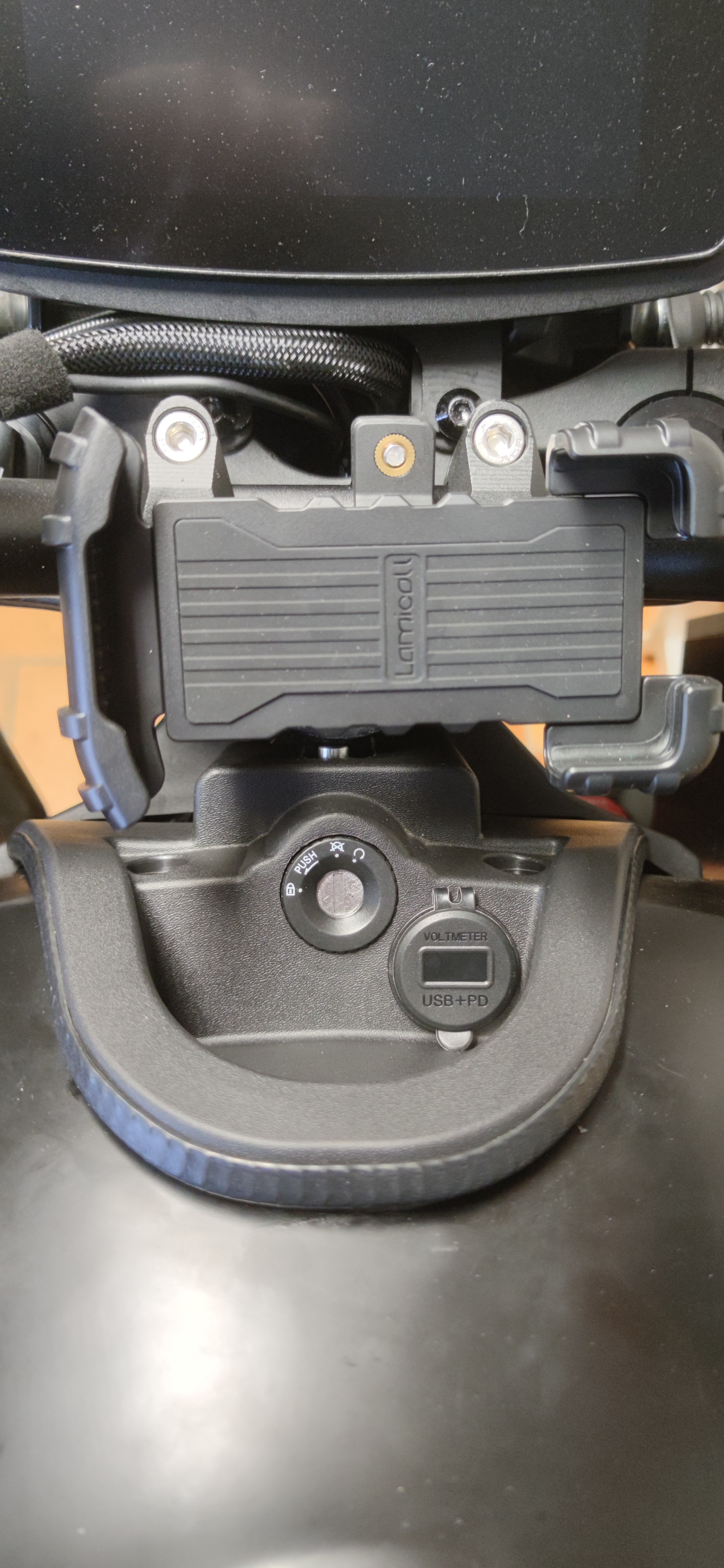 Ansonsten habe ich mir eine USB-Buchse 12-24V neben dem Zündschloss nachgerüstet und die Spannung an einem Sicherungshalter/Stecker auf der linken Seite unter dem "Tank" mit Hilfe einer Abgreifklemme ("Stromdieb") abgegriffen.
