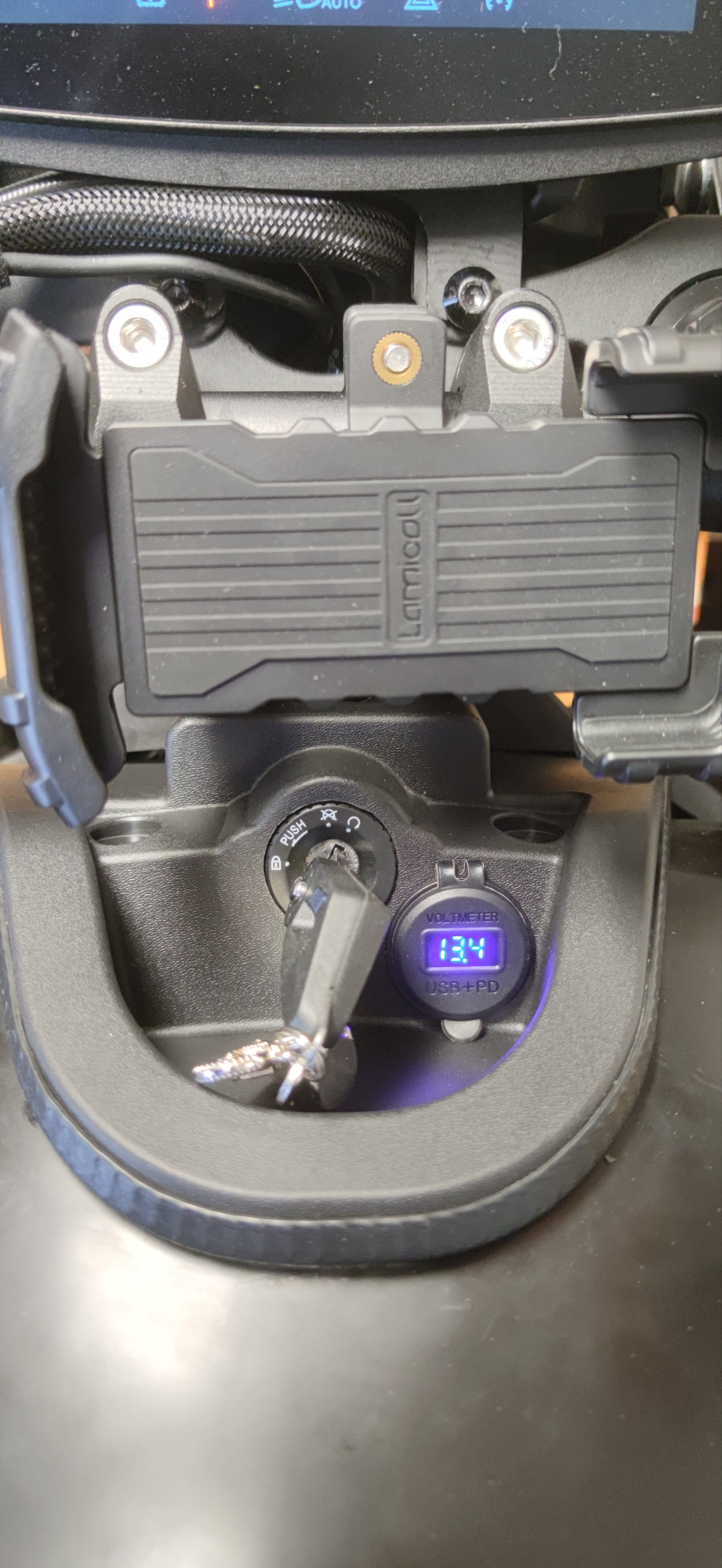 Mit einschalten der Zündung wird die Buchse versorgt und kann bei Bedarf über einen kleinen Taster unter der Abdeckung eingeschaltet werden. Dann wird die Spannung angezeigt und die USB-A und USB-C sind aktiviert.
