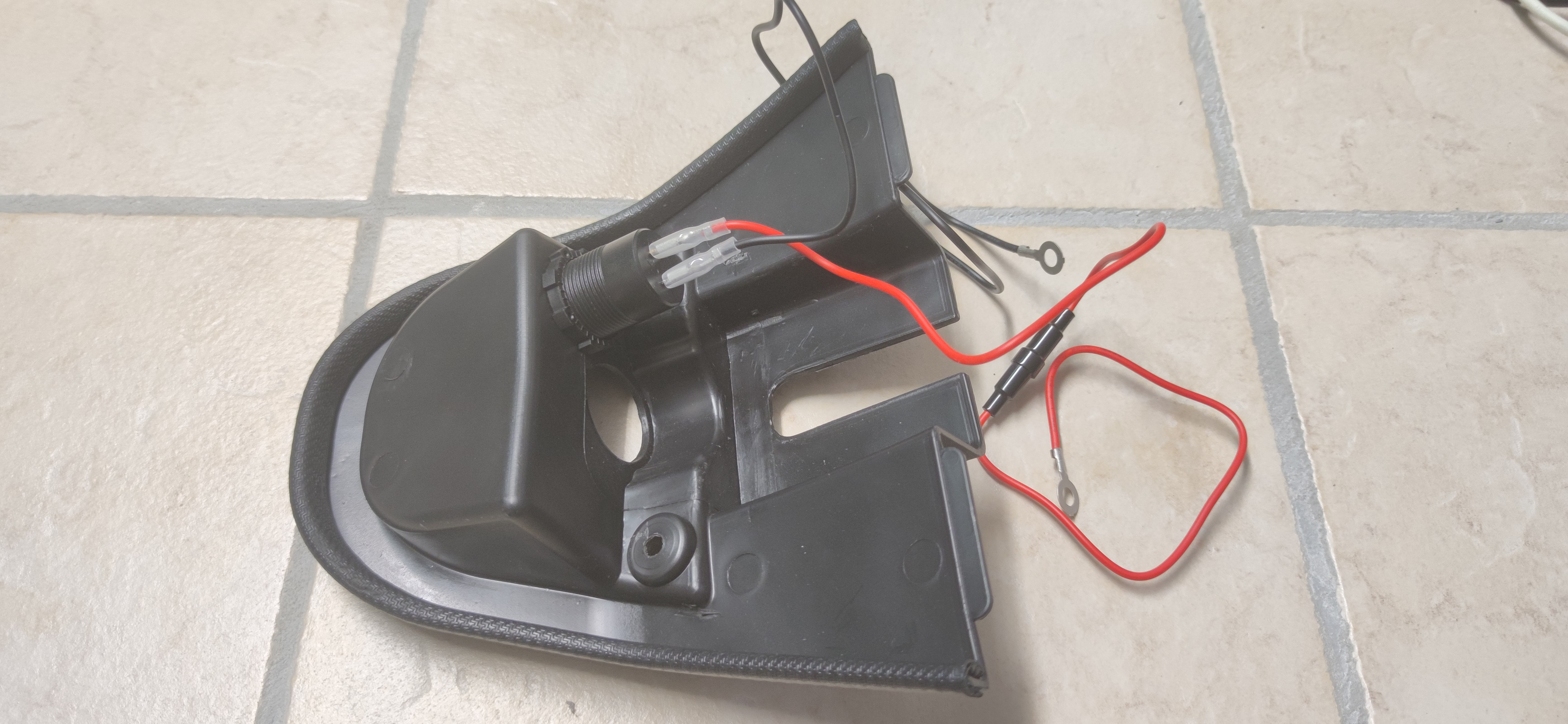 Am geschalteten Plus habe ich mit einem Abzweigverbinder (Stromdieb) die Plusleitung abgegriffen. Im Kabel von der USB-Buchse ist auch noch ein Sicherungshalter mit 10A. Die Sicherung habe ich gegen 3A getauscht, reicht vollkommen. Für Masse dann den Ringkabelschuh einfach mit der Schraube von der dreieckigen Blende mit befestigt.