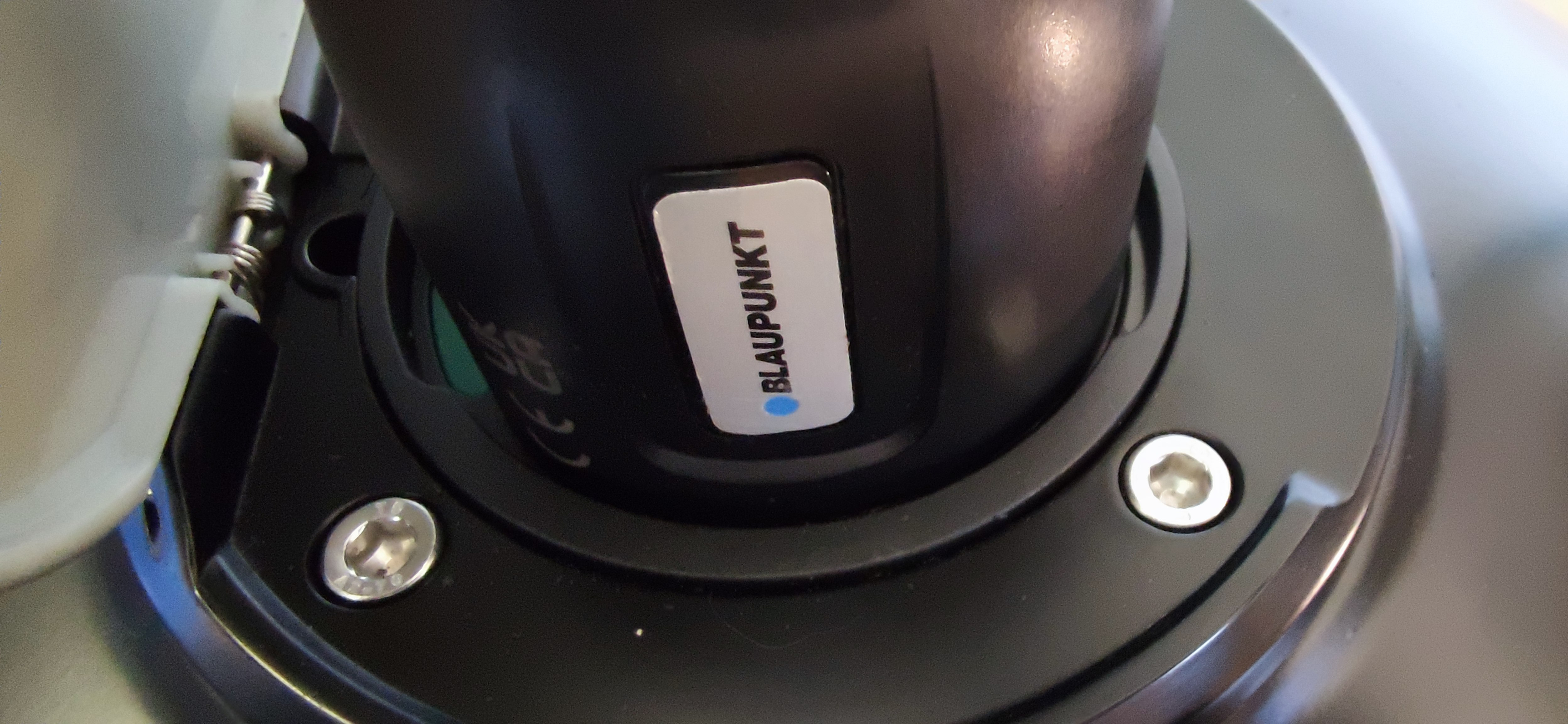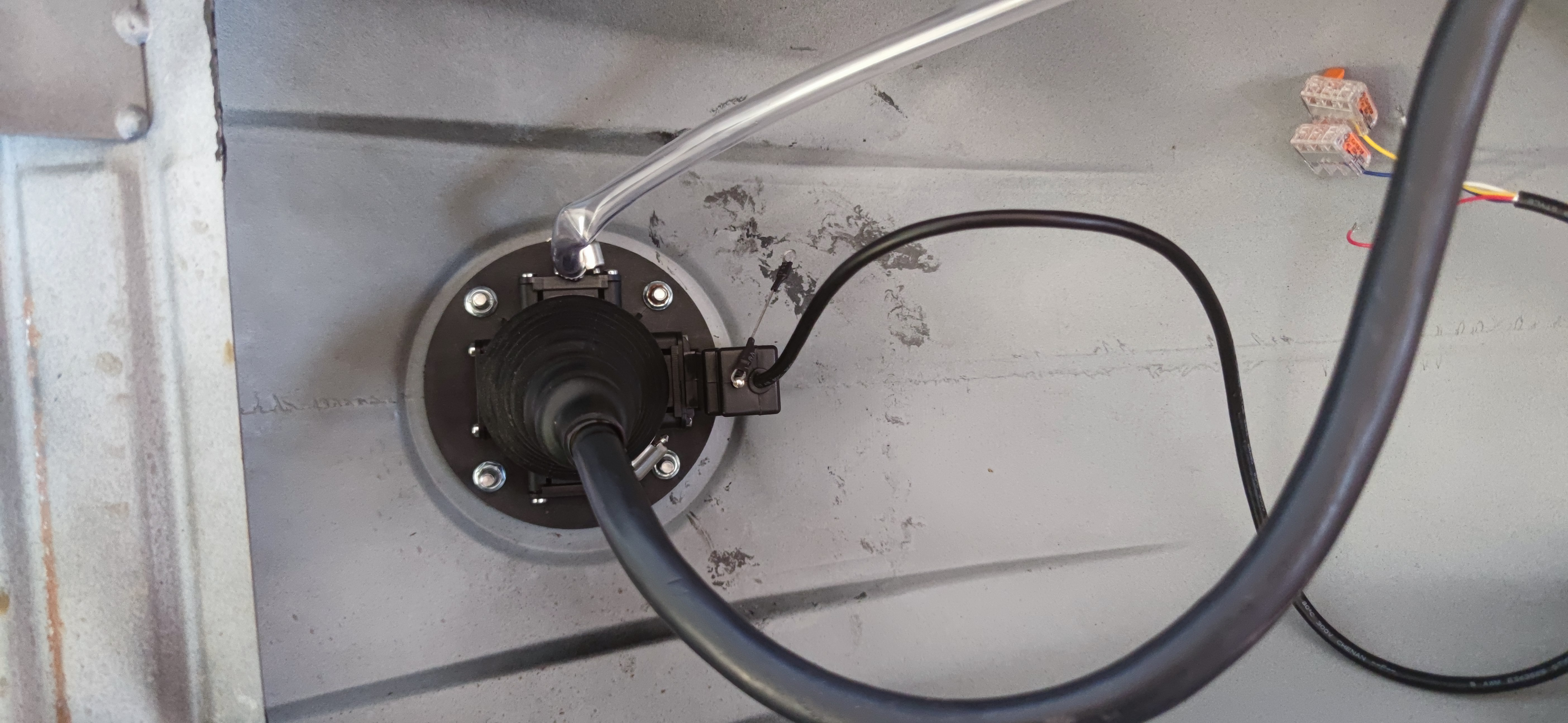 An der Ladebuchse sind auf 3 Seiten Blinddeckel und nach hinten der Ablaufschlauch, falls Mal Wasser in die Buchse läuft. Den Schlauch habe ich auf die linke Seite versetzt, um die Verriegelung auf der hinteren Seite montieren zu können.