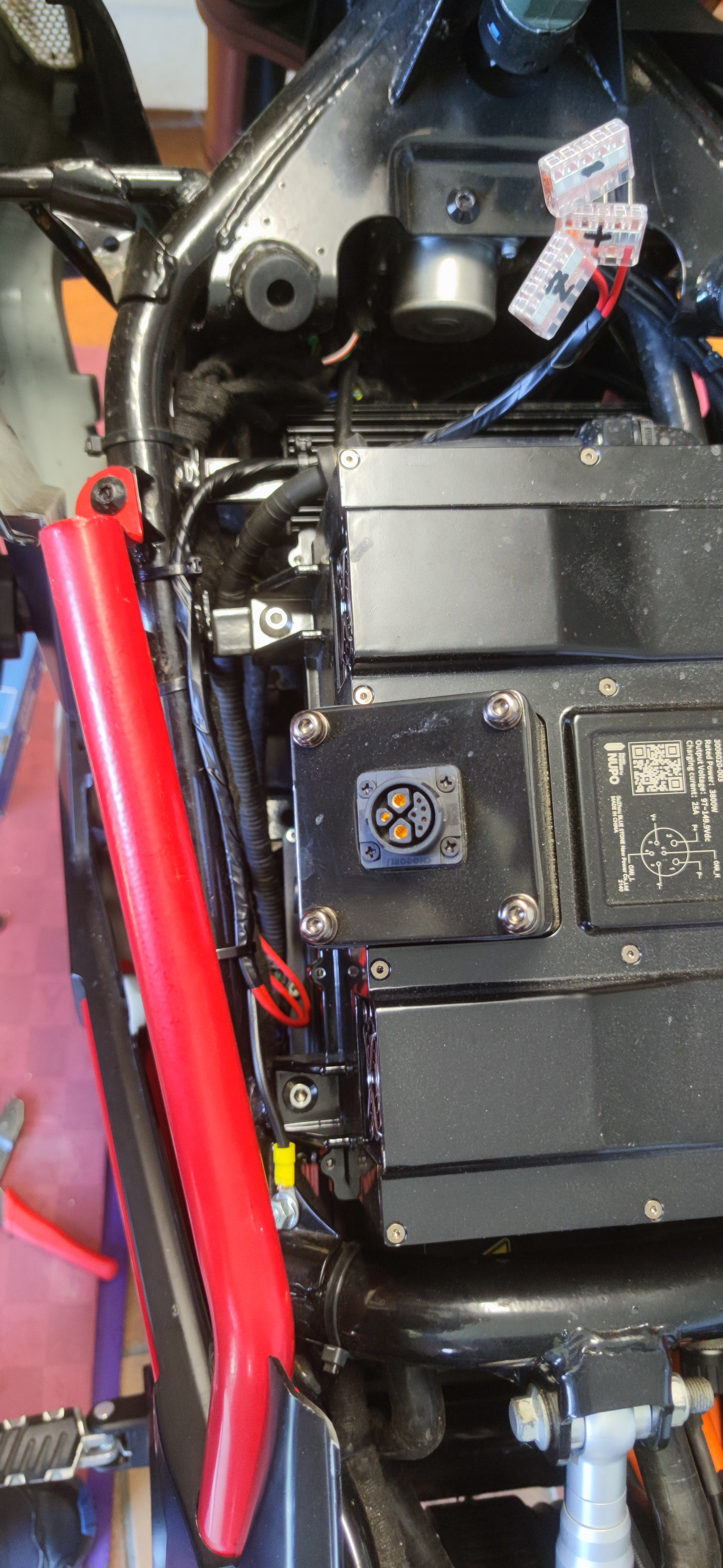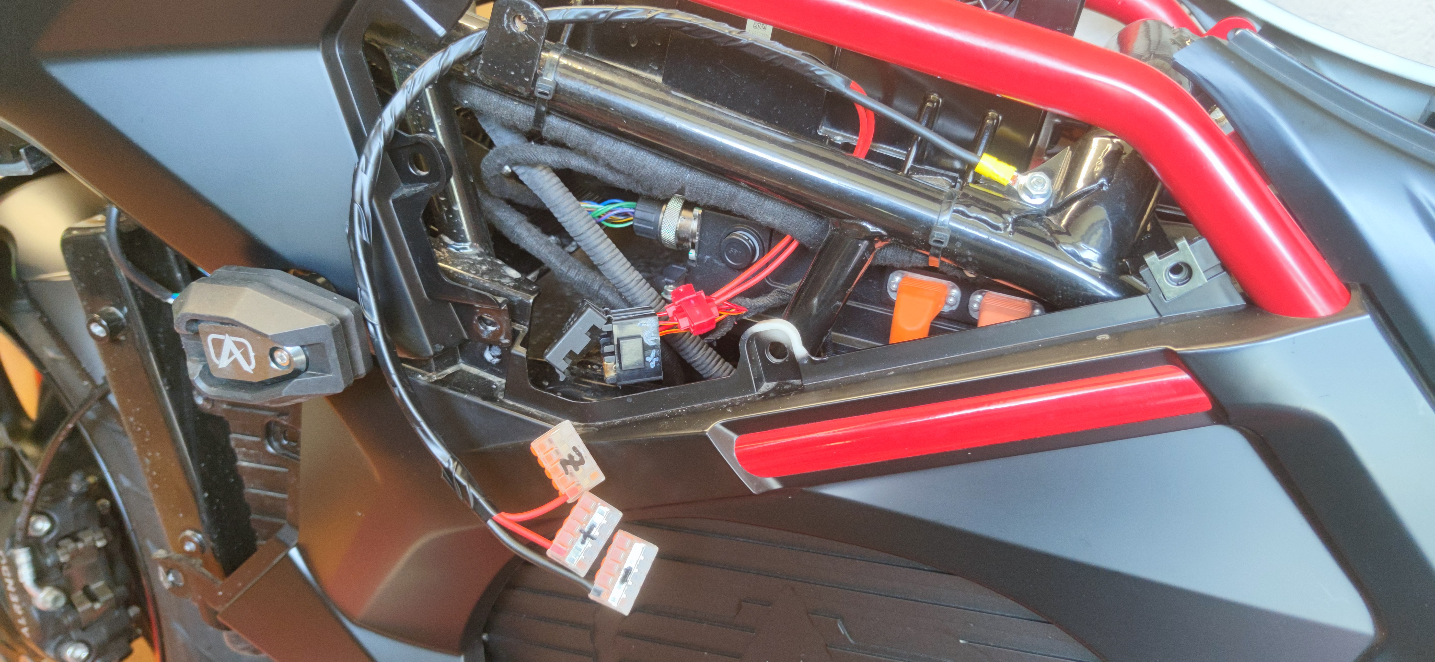 Nach links läuft auch das Wasser besser ab, wenn die Maschine auf dem Seitenständer steht. Dann erster Test, ob die Verriegelung funktioniert und festgestellt, dass der mitgelieferte Typ2/Schuko-Adapter minimal zu dick ist und gar nicht tief genug in die Ladebuchse geht. Beim bisherigen Laden ist mir das gar nicht aufgefallen. Mein Blaupunkt-Kabel und das feste Kabel meiner Wallbox gehen einwandfrei. Also den Stecker rundherum leicht abgefeilt, bis er ganz in die Buchse passt. Dann noch eine LED unter die rote Blende eingebaut, für die Verriegelungs-Anzeige. Dazu das vorhandene 3mm-Loch auf 5mm aufgebohrt und eine LED mit 1kOhm-Vorwiderstand für 12V eingeklebt. In die Blende vom Zündschloss dann mit dem Multitool und Feile eine Öffnung für den Taster erstellt. Dann die Verkabelung von den beiden Sicherungshaltern zur Blende vom Zündschloss verlegt. Masse mit Kabelschuh rechts auf dem Bild vom Rohrrahmen und Dauerplus und Zündungsplus hinter den beiden Sicherungen abgegriffen. Danach wieder alles in umgekehrter Reihenfolge zusammen bauen und als letztes den Taster, meine USB-Buchse, die Ladeverriegelung und die LED über die Klemmen entsprechend verbinden und dann die Blende wieder einbauen. Hier noch ein kurzes Video, wie das dann funktioniert.