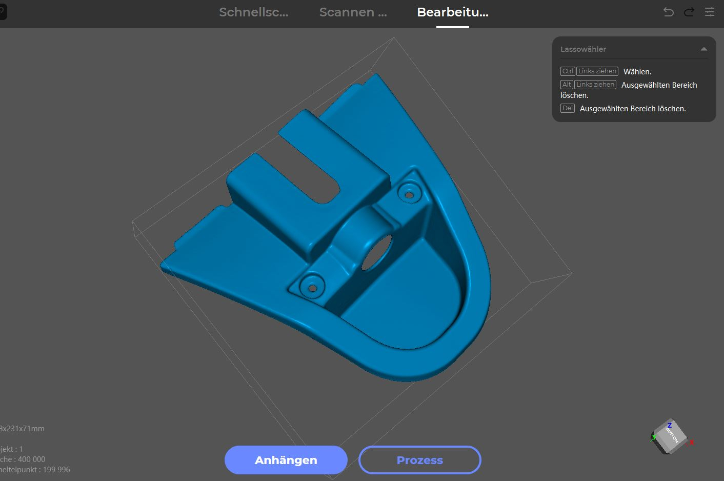 Es ist mit einem günstigen 3dmakerpro Moose Lite gescannt worden. Ich habe drei Scanns gebraucht um alles vollständig zu erwischen. Ist mein erstes Teil das so groß ist. Die kleinen Teile die ich sonst gescannt habe waren einfacher. Ich kann leider die Modelle nicht bearbeiten, da kenn ich mich nicht mit aus. Ich habe den Scanner gekauft um genau solche Sachen zu duplizieren die ich selbst nicht konstruieren kann. Wenn ich damit jemandem helfen konnte, bin ich glücklich.