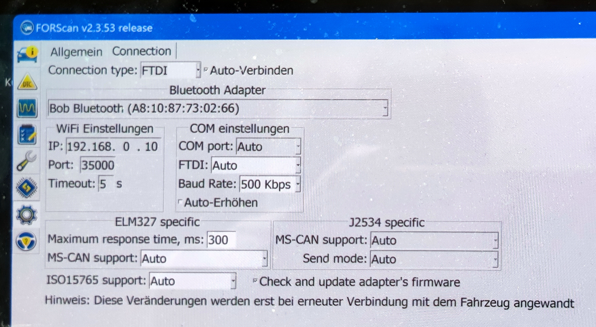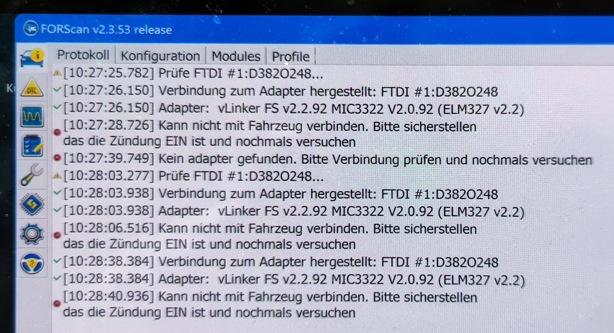Nachdem derDauerregen gerade für ein paar Minuten aufgehört hat,habe ich meinen Notebook in den Hof getragen, FORScan angeworfen und das USB-Interface mit dem OBD2-Connector verbunden.