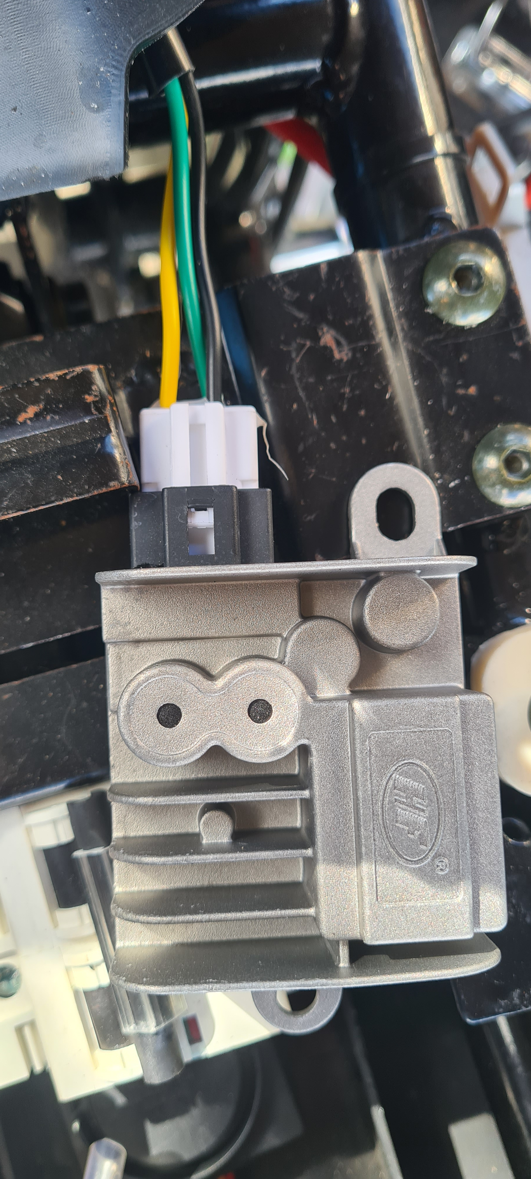 Üblich ist Gelb als Zündungs-Plus. Da gehe ich davon aus, dass das das Rote Kabel zum Zündschloss permanet auf 80 Volt liegt und das Gelbe Kabel nur dann, wenn Zündung AN wäre. Nur zwei Kabel gehen zum Zünschloss, wie üblich beim E-Fahrzeug. Gelb wird allerdings am Stecker zu einer anderen Farbe übergeben und die Leitung muss sich dann aufteilen zu mindestens drei Stellen.