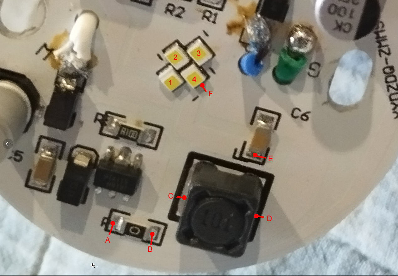 Versorge die Seite mit der weißen Leitung mal mit Spannung (Weiß an Plus, Grün an Minus) und checke dann mit dem "Tester" (der G4 LED), gegen Plus am Labornetzgerät an den Punkten A bis F.