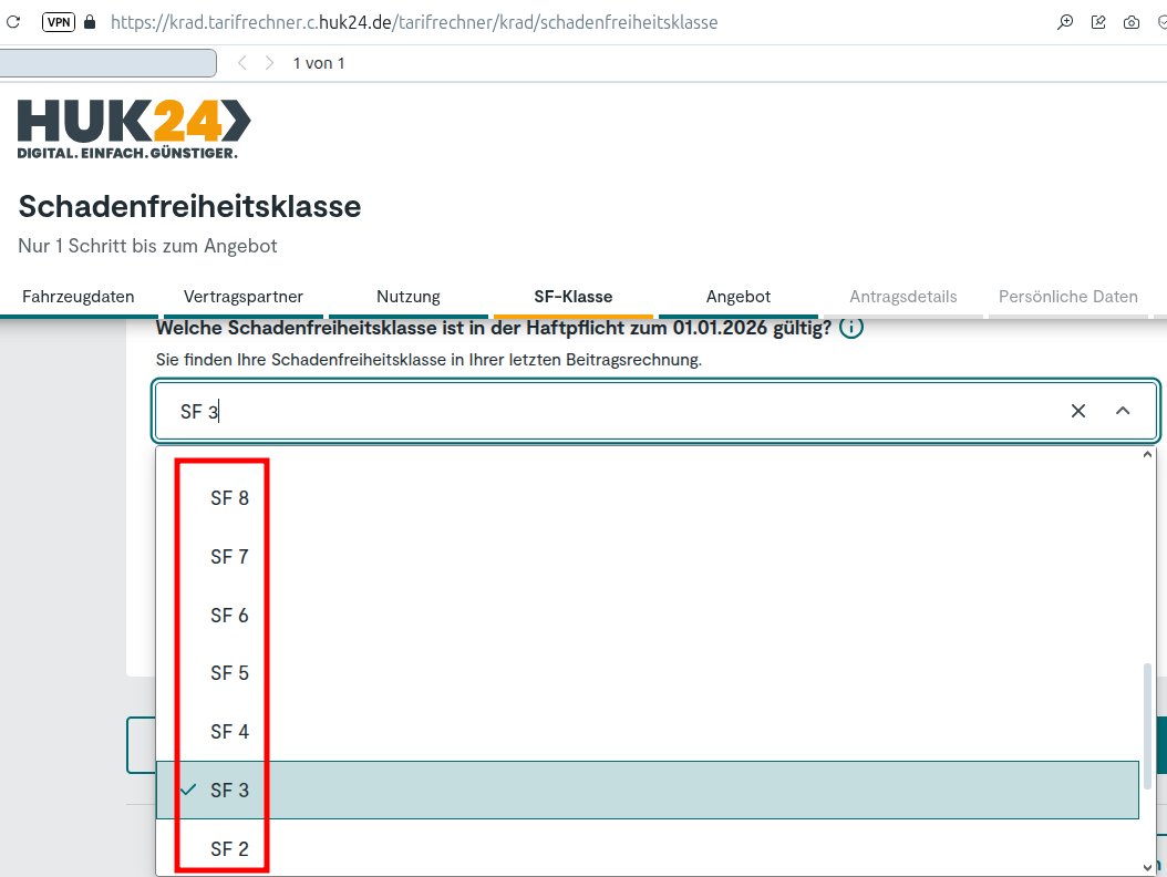 Auch lässt die Beitragsberechnung die HUK-24 die SF-20 durchgehen, und der Beitrag ist dann auch ca. 4 € (pro Jahr) niedriger, wie wenn ich nur SF-3 angebe. - Sicher nichts weltbewegendes, aber wenn ich bedenke, dass ich bei meinem Pkw SF-24 habe, und der Rabatt von dort ursprünglich übernommen wurde, doch ärgerlich. Ich glaube jetzt nicht, dass ich mit Angabe des SF-20 bei der HUK durchkomme, wenn von der Vorversicherung SF-3 angegeben wird.
