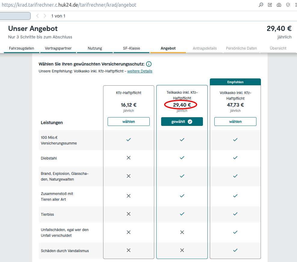 Übrigens sollte man in diesem Fall eine Teilkasko ohne Selbstbeteiligung wählen, weil die weniger als 1 € teuerer kommt als die mit 150 € SB, und auch nur 1,50 € teuerer ist als die mit 300 € SB.