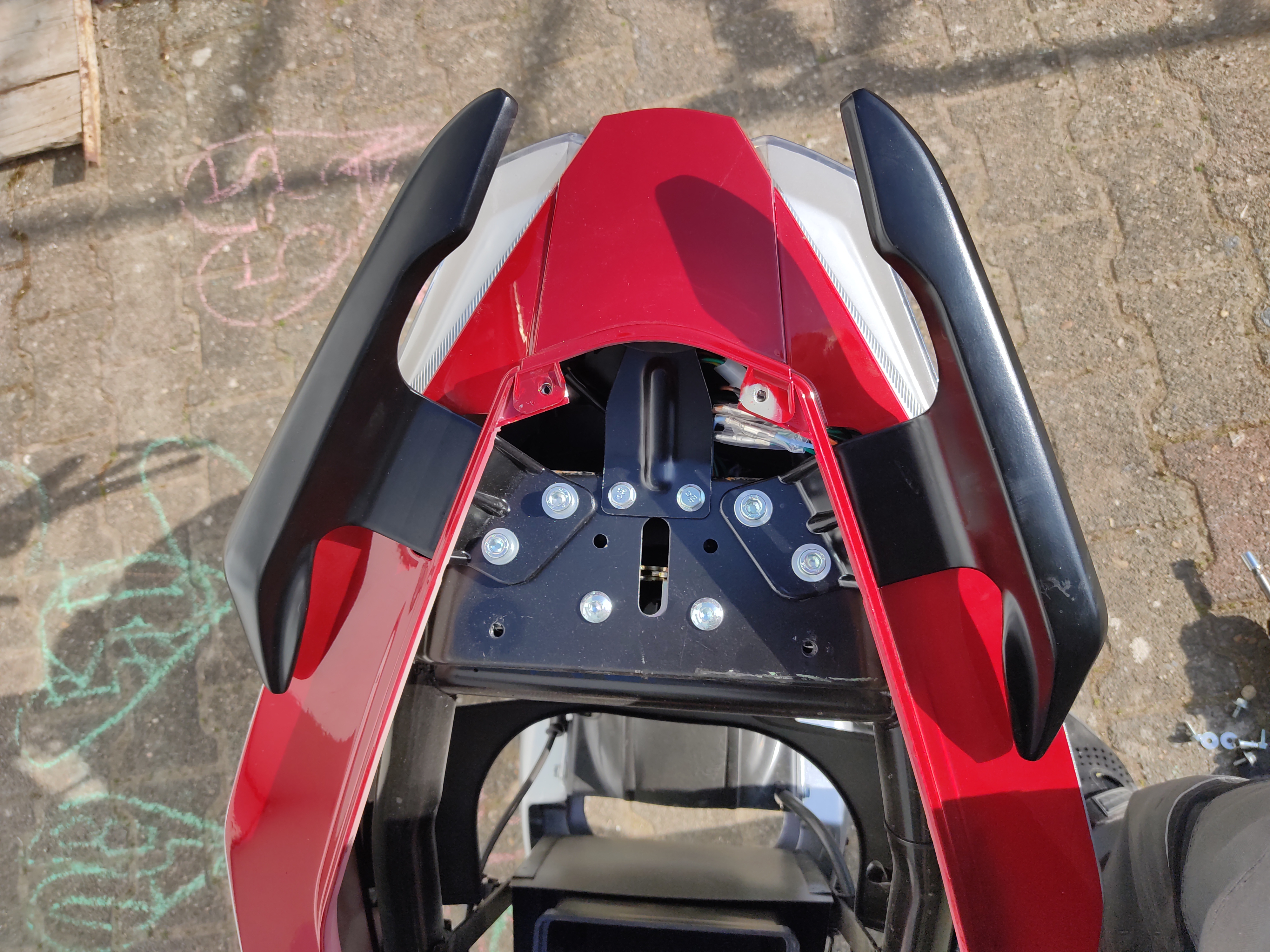 Die erste Fahrt hier in einem Feldweg hab ich hinter mir. Die Gabel ist viel zu hart da muss man was machen entweder andere Federn oder ölstand ändern. Das extreme Last Spiel nervt. Einen kurzen Blick under die Verkleidung hab ich schnell gemacht bevor es die Frau mitbekommen hat. :)