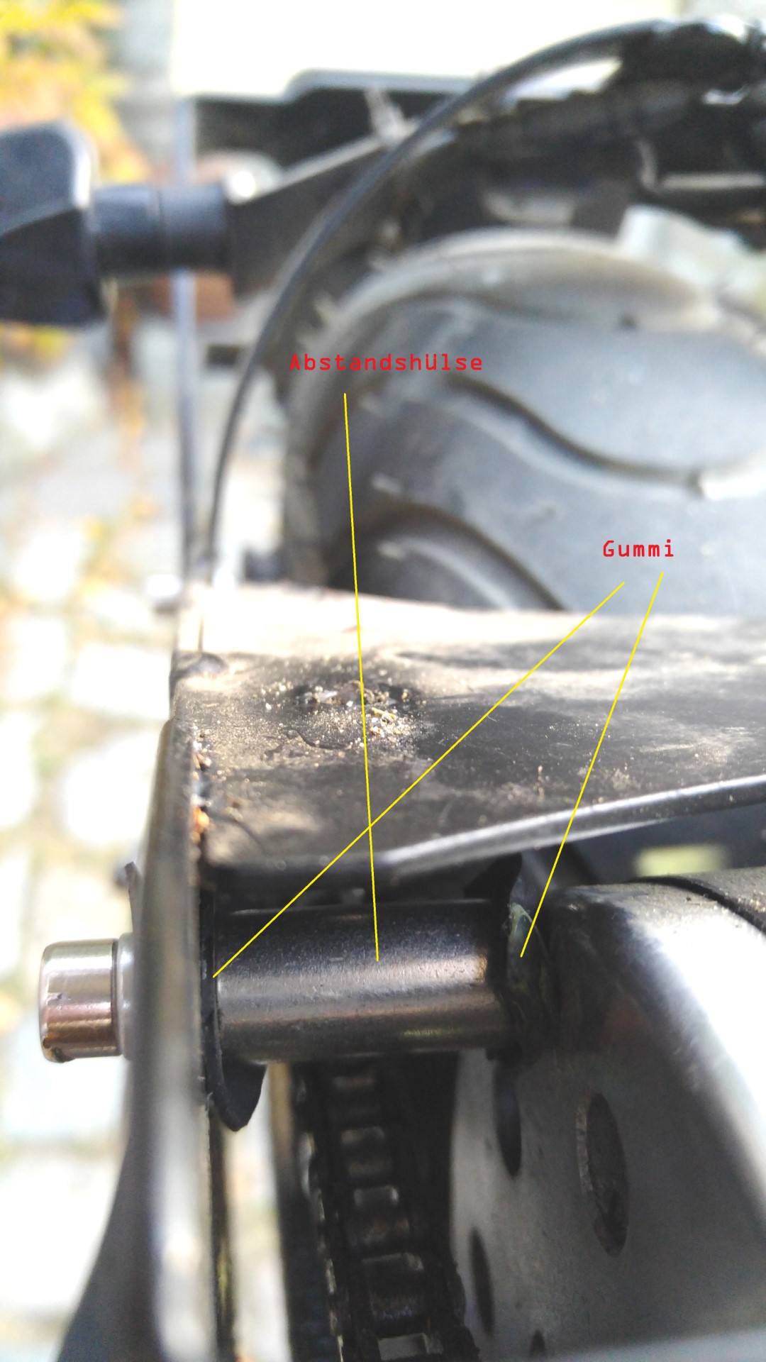 Um das Ganze zu dämpfen habe ich mir 3 Stücke aus einem Fahrradschlauch geschnitten (ca. 2x5cm). Diese habe ich etwa im Drittelabstand zwischen Motor und Rahmen soweit ging geschoben und dann mit der Zange durchgezogen. Da der Gummi sehr elastisch ist, kommt man gut durch. Der Motor ist jetzt hinten elastisch mit diesen 3 Gummipuffern im Rahmen verankert (Bilder: "Dämpfung Motor"). Ich hatte erst versucht den Gummi umlaufend auf den Motor zu kleben, aber dafür hat der Durchmesser der Öffnung nicht gereicht.