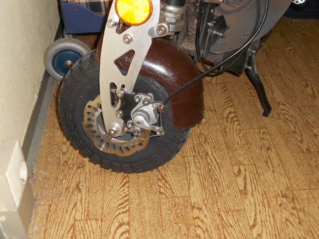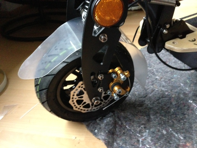 ich fuhr mit meinem Scooter bei jedem Wetter. Für das Vorderrad habe ich mir ein Schutzblech selbst gebaut. Ein Bogen vom Abflußrohr der Länge nach halbiert und mit Gewindestange und diversen Kleinteilen aus dem Baumarkt fixiert. Schon hat man für kleines Geld und viel Spaß dabei einen Spritzwasserschutz.