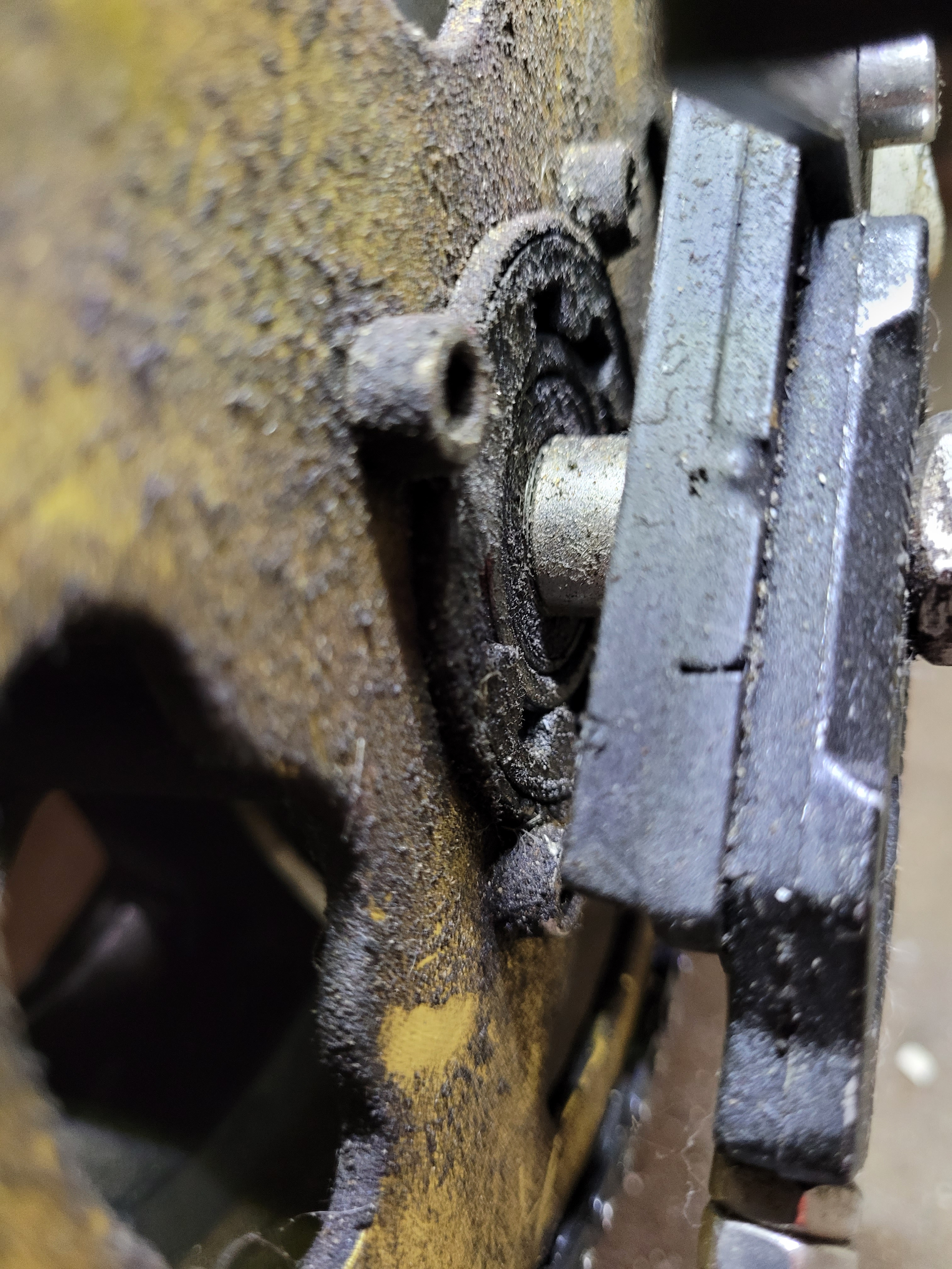 Auf dem anderen Foto kann man vor Dreck nicht viel erkennen. Da sind vier "Augen" - gehören da nicht genau die Bolzen rein, mit denen das Kettenrad verschraubt wird? Vielleicht hast du ja grade die letzte Schraube verloren...
