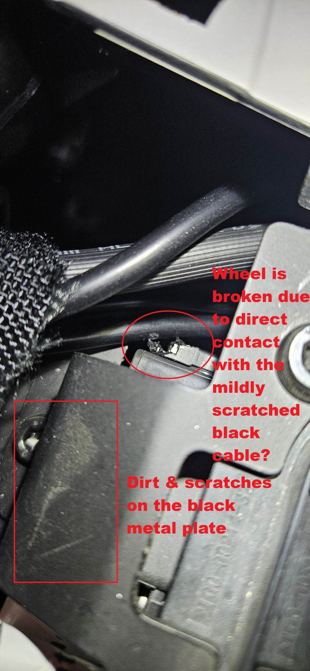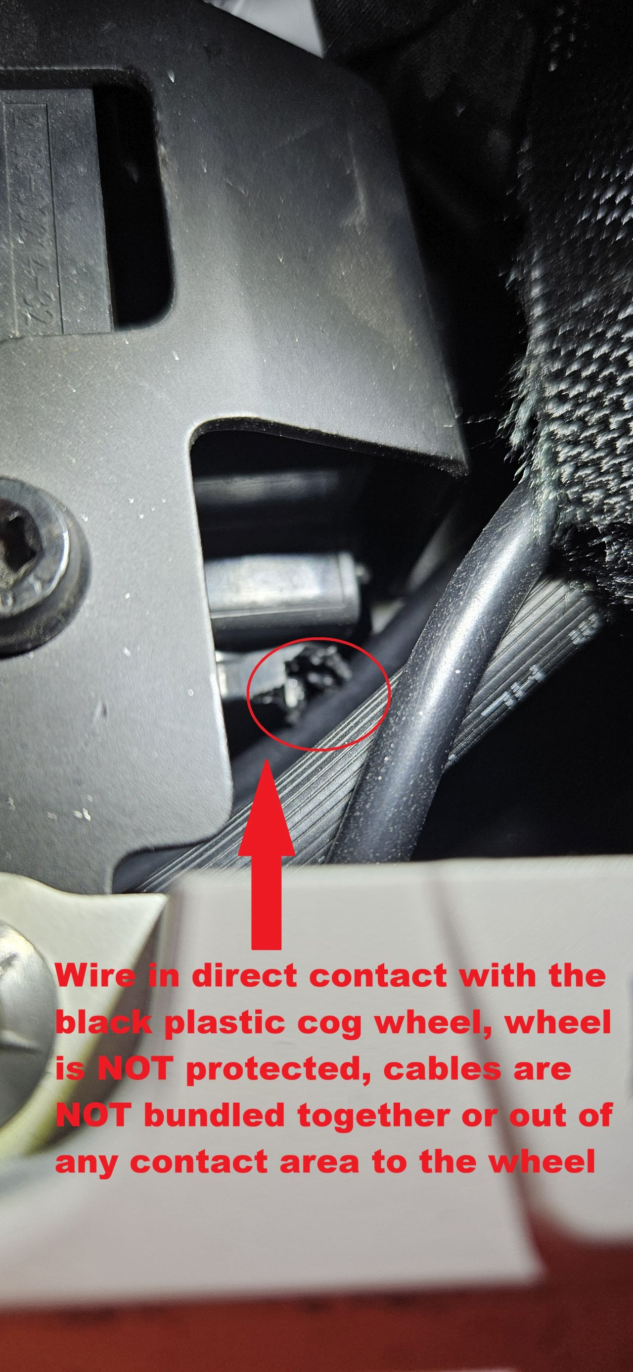 Kabel & Leitungen sind extrem eng, nicht fixiert und ungeschützt an einem beweglichen Bauteil (Zahnrad) entlanggeführt wurden.